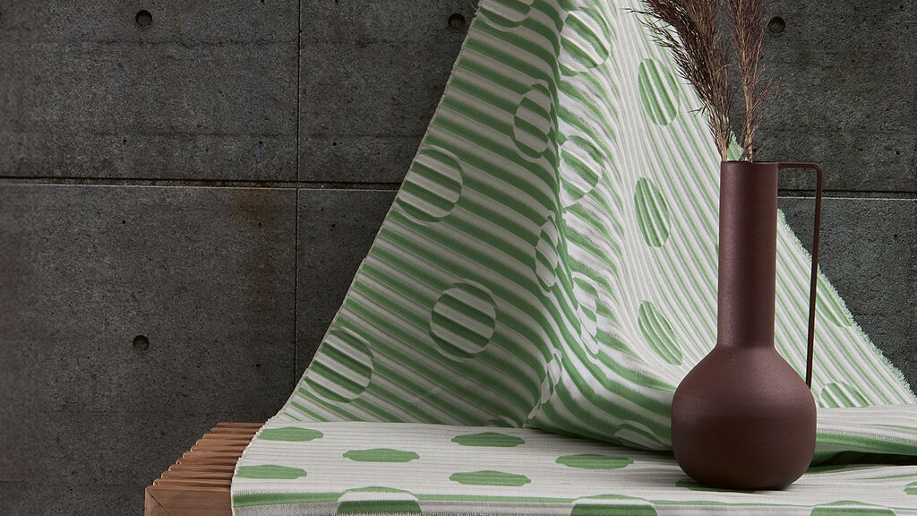 FR VISION is inspired by the Tabula Scalata art technique and transfers it to textile surfaces. Depending on the viewing angle, changing image motifs are created – an effect that is not only aesthetically impressive, but also opens up new design possibilities. By combining special heat-sensitive yarns with acoustically relevant weaving techniques, a fabric has been created that combines visual fascination with highly efficient sound absorption. FR VISION consists of 30 per cent recycled material, is durable, flame-retardant, dimensionally stable and easy to clean.