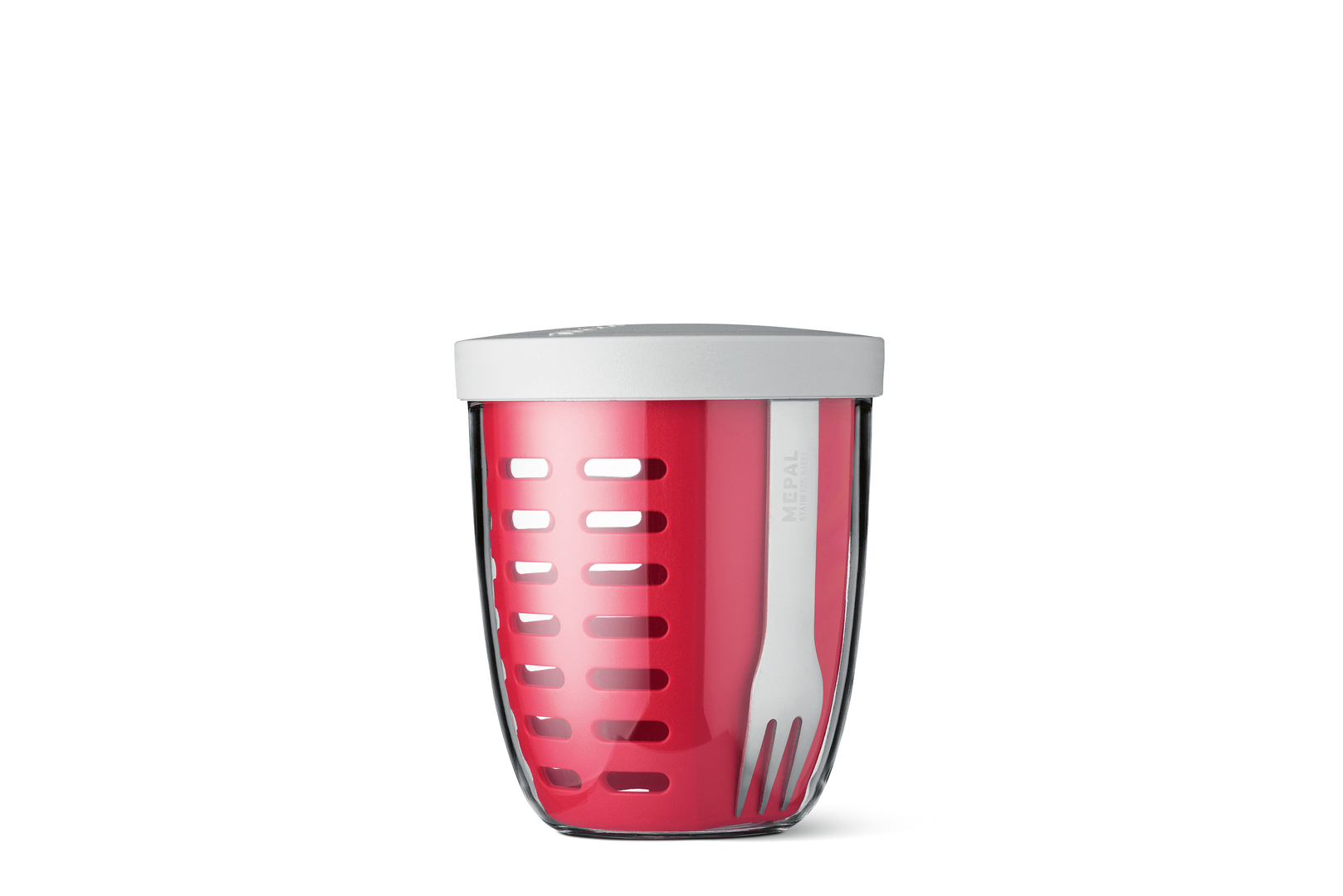 The Fruit & Veggie Pot Ellipse was specially developed for people who want to take fresh fruit or vegetables with them and wash them on the spot before eating. An integrated strainer allows the water to drip off, while the stainless steel fork that comes with the pot enables hygienic consumption of healthy snacks. The high plastic container rests comfortably in the hand and holds a good daily portion of fruit or vegetable strips. Its air- and watertight lid keeps the raw food fresh and prevents the leakage of liquid.