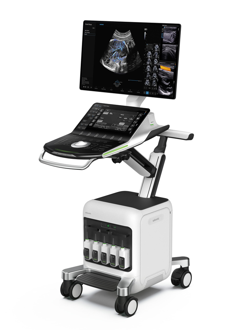 This is a 4D Colour Ultrasound intended for ultrasound examination throughout the department. To maximise the presentation of the operating table, the auxiliary screen and operating table are covered by a curved screen. The buttons and functions can be operated by touch and customised to the doctor’s preferences. The main touch screen can rotate, extend, and be used to control the device, allowing the ultrasound to have a greater operating range.