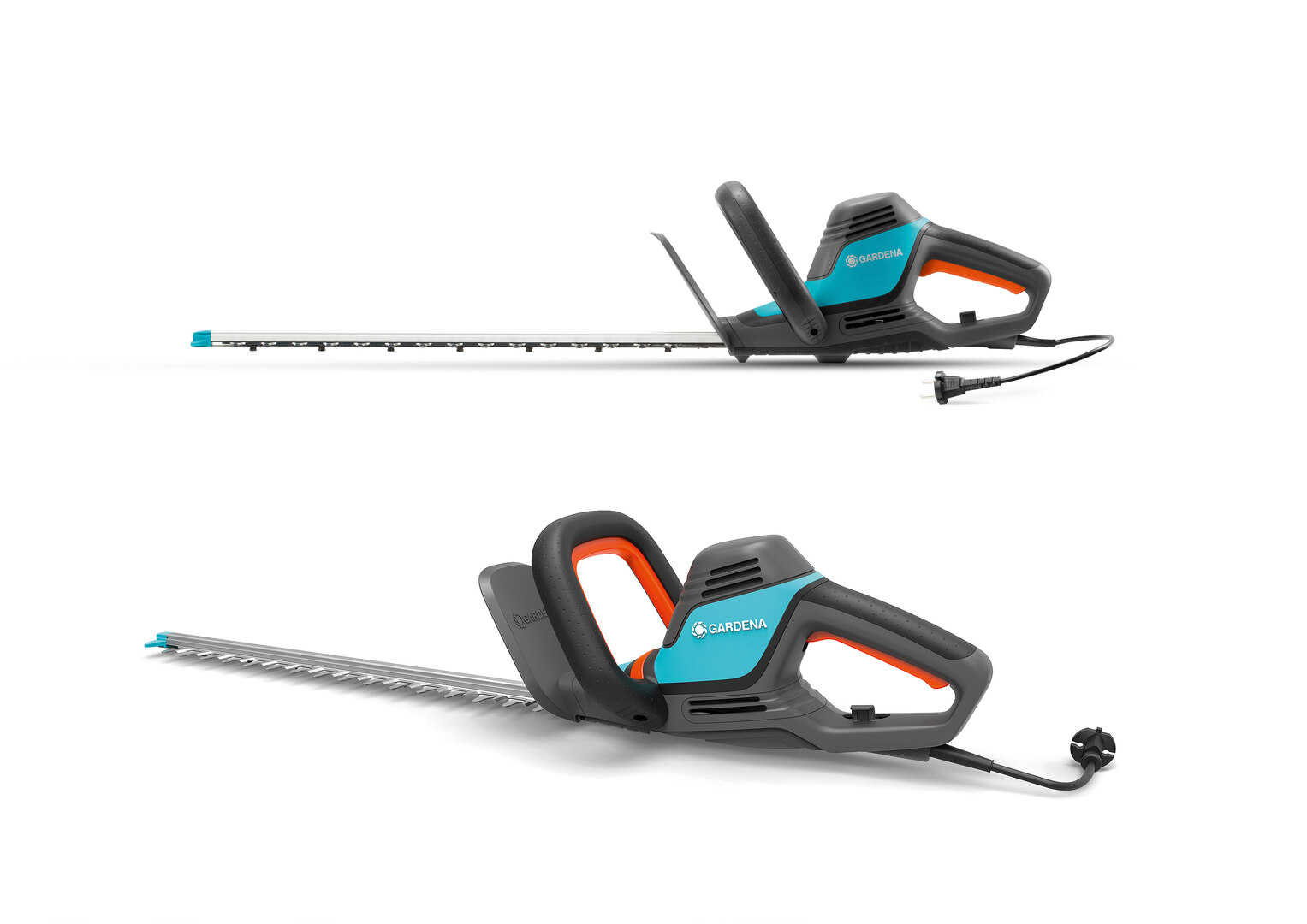 The hedge trimmer by Gardena not only allows for easy handling but is impressively powerful. Its design is characterised by a compact motor with rounded edges and two ergonomic handles, the distance between which has been carefully balanced. Thus, the closed front handle offers optimum support when hedges are trimmed with vertical movements. Dark colours give the impression of solidity, while turquoise-coloured elements, such as the clearly visible knife protection tip, bring lightness into the design.