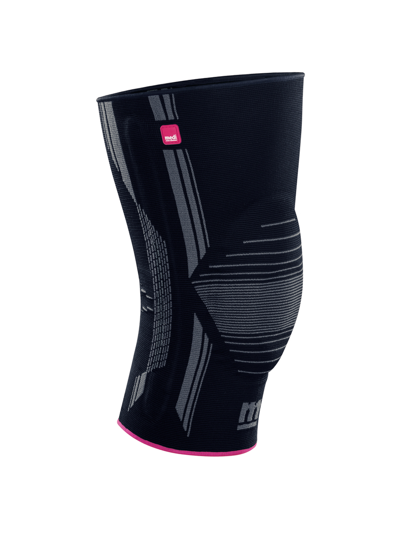 The special knitting technology and a highly elastic knit construction allow this knee support to be put on with ease. Special comfort zones at the back of the knee ensure wearing comfort without constrictions in this sensitive bending area. Furthermore, an open silicone patella ring provides maximum relief for the user's kneecap. High-tech fibres guarantee enhanced breathability and safeguard against unpleasant odours. In addition, an integrated top band with non-slip rubber dots keeps the knee support positioned correctly on the leg.