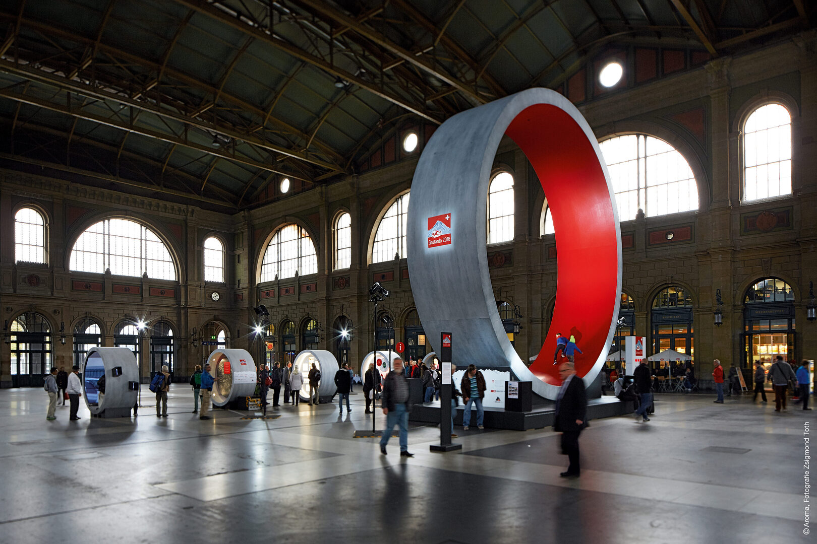 In order to draw attention in advance of the grand opening of the Gotthard Base Tunnel in 2016, this mobile exhibition was created and sent on tour with ten stops throughout Switzerland. The objective was to convey the history and significance of the tunnel by providing a vivid experience of the technology as well as the topic of mobility in the future, based on facts and figures. Therefore, the exhibition featured a cross section from the actual 9.5-metre-high tunnel as a true eye-catcher. As an attractive photo spot, the cross section invited viewers to actively use and personally interact with this element.