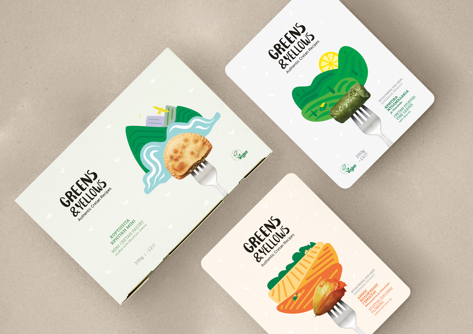 Greens&Yellows is a range of handmade frozen vegan meals made following Cretan recipes. Inspired by the natural ingredients, the design concept conveys a sense of nature, innocence and honesty. It creates associations with typical Cretan experiences in a bid to raise the profile of the brand. The design combines a photo realistic illustration which depicts the product with an abstract environment comprising clear shapes and colours. This combination achieves a visual balance. The logo, like the meals, is handmade and shows the brand name in a contemporary style.