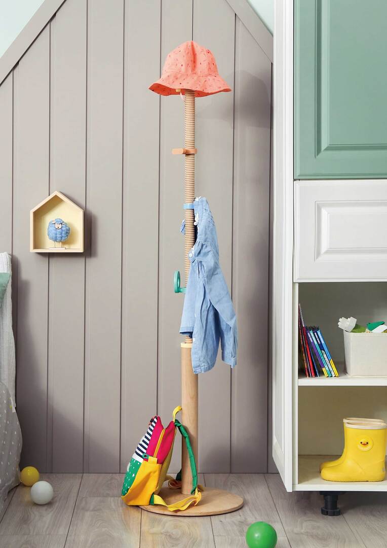 Growing Coat Tree was inspired by the idea that ‘small saplings grow into big trees’ and features a telescopic structure that can be adjusted as the child grows taller. Colourful geometric hooks function similarly to nuts, allowing them to be adjusted in height and direction. Growing Coat Tree, with its smart structure, bright colours, and geometric elements, will entice children to organise their belongings on their own, form good habits while they are young, and promote organisational skills as they grow into adults. The sturdy round base ensures stability and provides a safer environment for children. Red Dot Award: Design Concept | Concept | Childhood