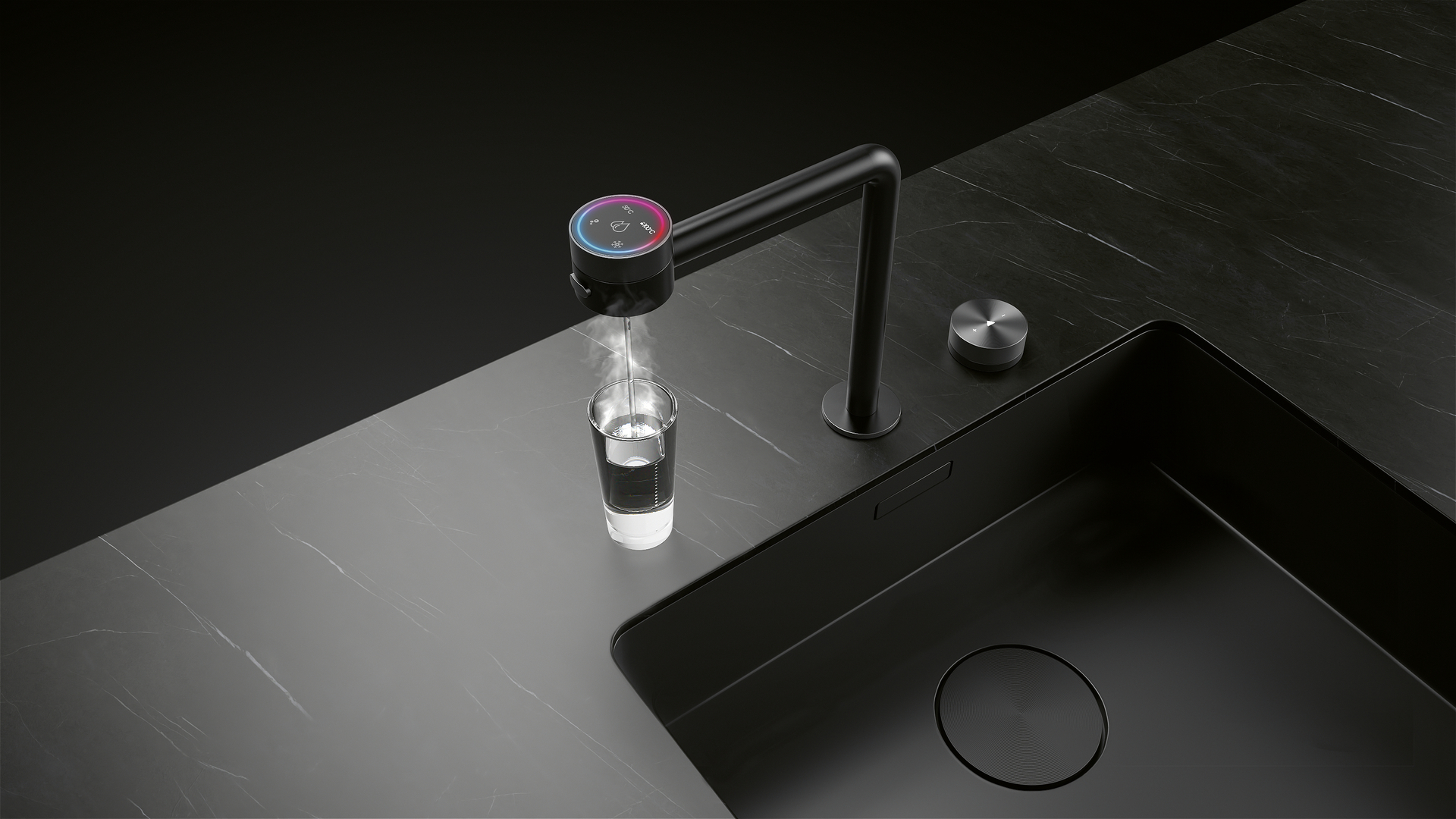 H2Oplus is a multifunctional kitchen faucet characterised by a minimalist design with round elements. The intuitive touch control panel on the spout is convenient to use, allowing the setting of temperature and water flow. With a light press on the toggle switch, the spray function can be activated to efficiently clean the sink. Separate water flows for drinking water and regular water ensure a safe and healthy liquid supply.