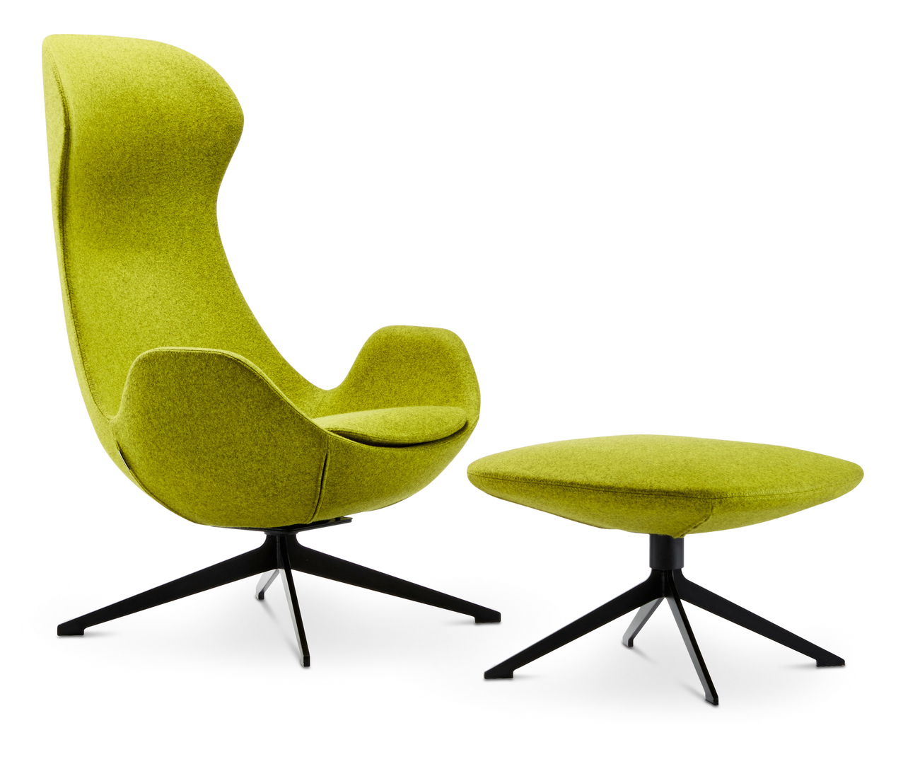 The design of the Halia armchair is inspired by fairy wings, which reflect in the gently curved lines. The comfortable chair is suitable for both contemporary living and work spaces. It can also be customised for the use in public spaces such as hotels, hospitals and educational institutions. Its legs are available in robust epoxy finish. The armchair is available with either a high or a low backrest and comes in a variety of fabrics and leather seating options.