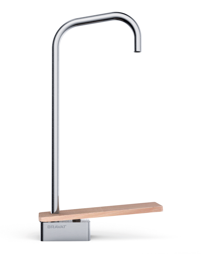 This purist water dispensing tap functions on the principle of a seesaw and makes use of the lever principle to fill glasses or cups. The weight of the vessel activates the water flow, removing it stops the water flow automatically. By this means, the user always has one hand free, since he no longer needs to operate a lever, thus making the tap particularly hygienic. The tap is made of high-quality lead-free brass and stainless steel.