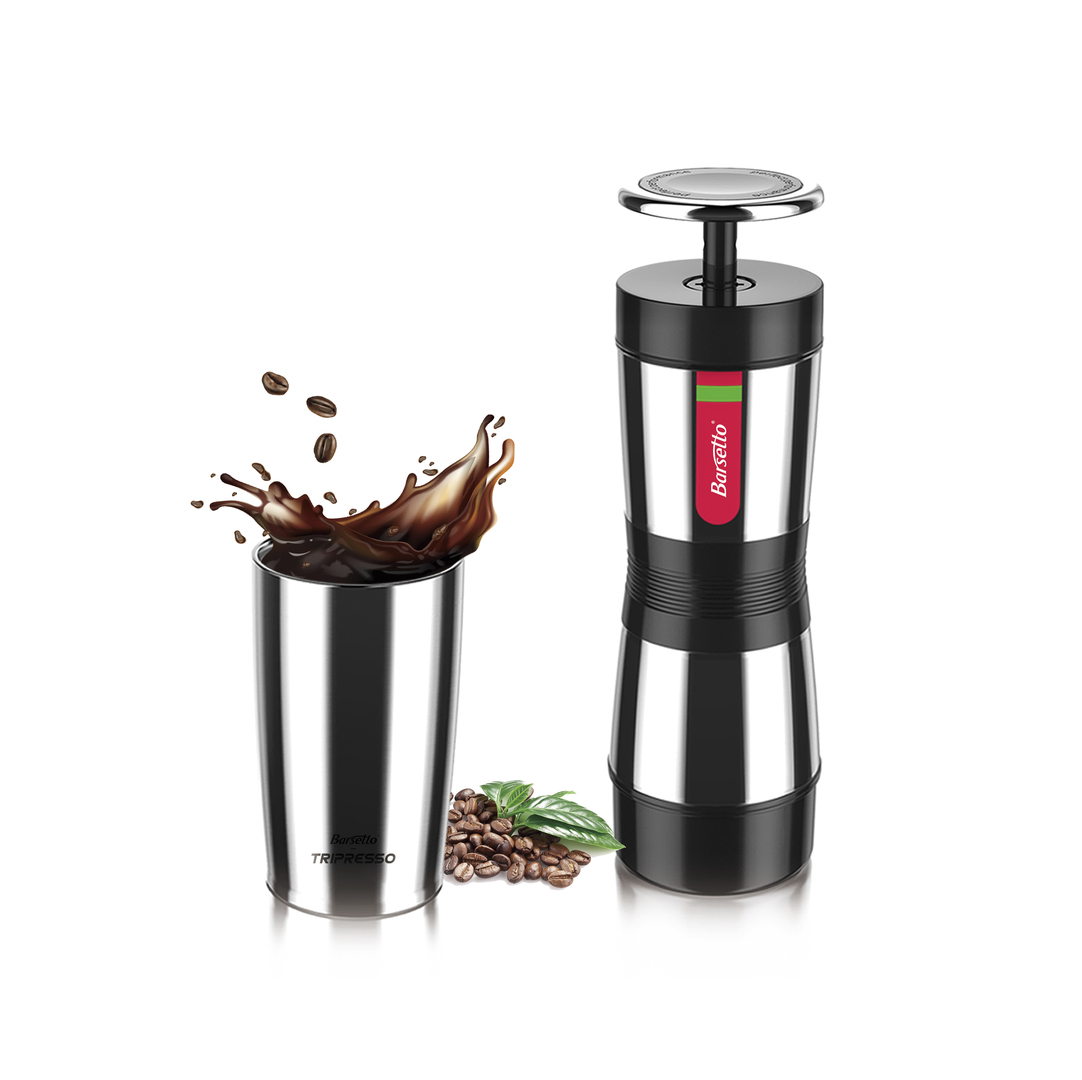 This hand-operated capsule coffee maker allows users to have a fresh cup of coffee on the go. To make a cup of coffee, users only have to push down on the plunger several times. The design is minimal, compact and easy to use.