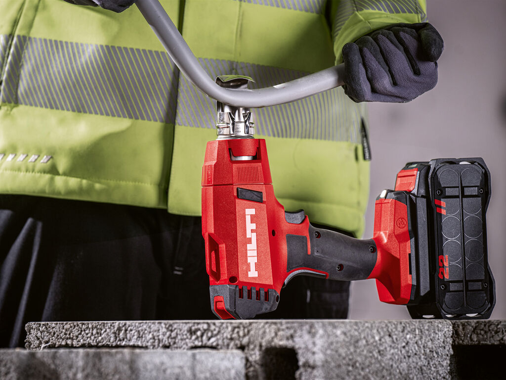 The Hilti NHG 6-22 is a cordless heat gun for use on construction sites. It quickly reaches temperatures of 300 to 500 degrees centigrade and is suitable for bending pipes, processing heat-shrink tubing and removing stickers and paint. An integrated LED display signals the heating process: 300 degrees in four seconds, 500 degrees in 20 seconds. The high-performance fan delivers an airflow of up to 300 litres per minute at 500 degrees, while the patented constant-on switch feature enables uninterrupted operation.