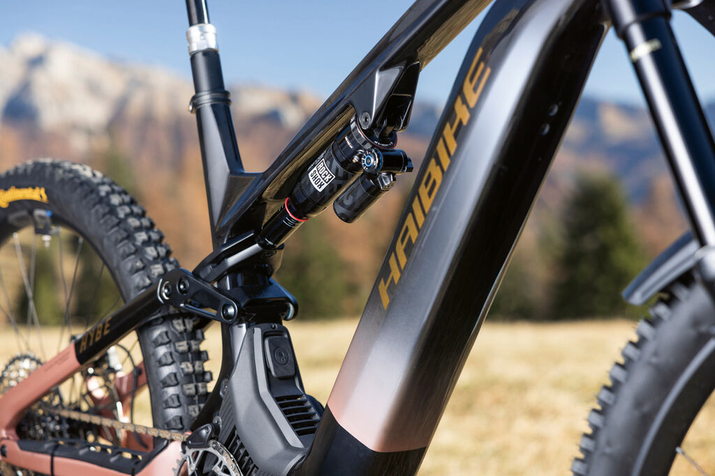 The HYBE CF 11 is an e-mountain bike with a carbon frame designed for demanding trails and versatile terrain. The frame geometry combines a mullet wheel set-up with 170 mm of front suspension and 160 mm at the rear. The motor is integrated into the frame and fully enclosed. This concept not only allows the battery in the closed down tube to be removed, but also ensures a reduced, functional design. The low centre of gravity and low overall weight ensure agility and traction both downhill and uphill.