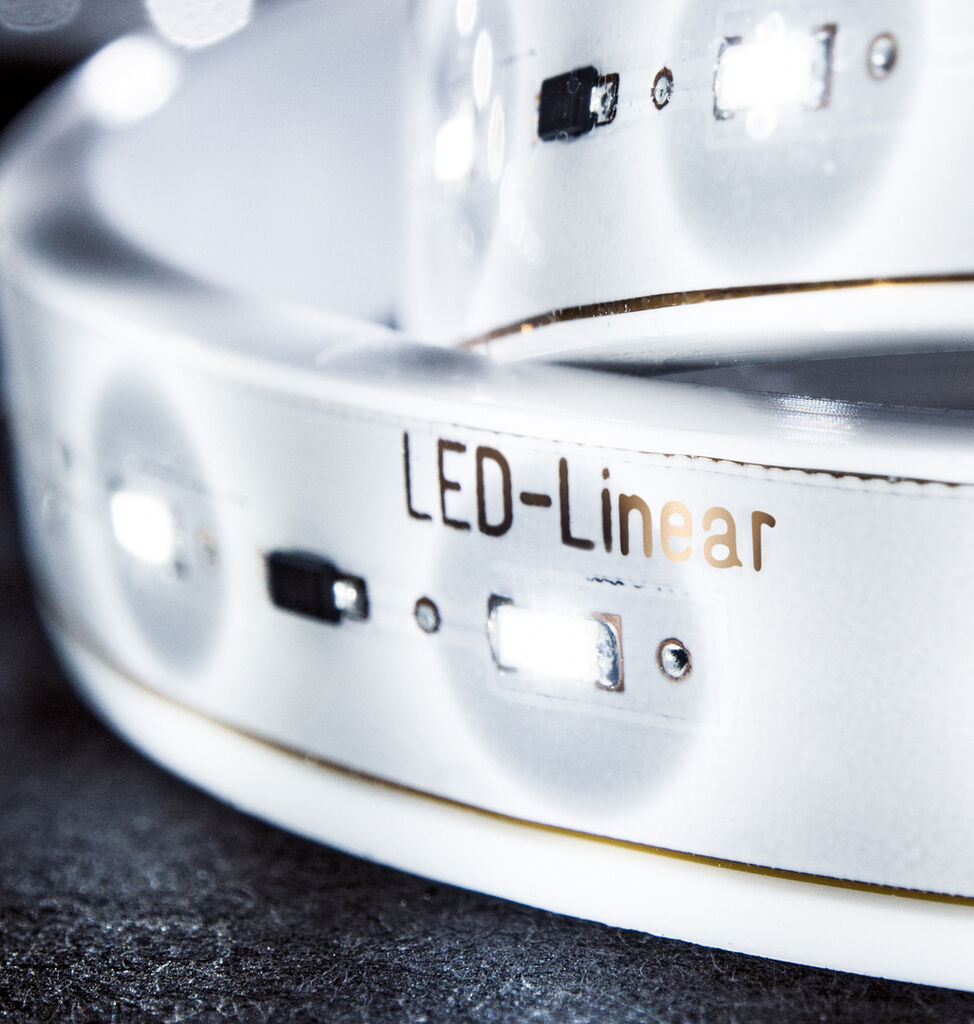 Hydralux is a line of LED lights that is flexible in use. The luminaire can be cut to the desired length on site and easily be installed by adhesive bonding. It is field attachable from 62.5 mm to a maximum of 7.5 metres with only one electrical supply. The filigree linear luminaire in IP67 is available with up to 1,637 lm/m. The white base profile with lateral fins and reflective surface ensures a high light output. Hydralux lights are waterproof, dustproof and UV-protected by a polyurethane encapsulation. The well thought-through concept and the small cross-section, with a width of 12.5 mm and a height of 3.5 mm, allow for a flexible use in different areas such as shops and retail lighting, or applications in furniture and shelves.