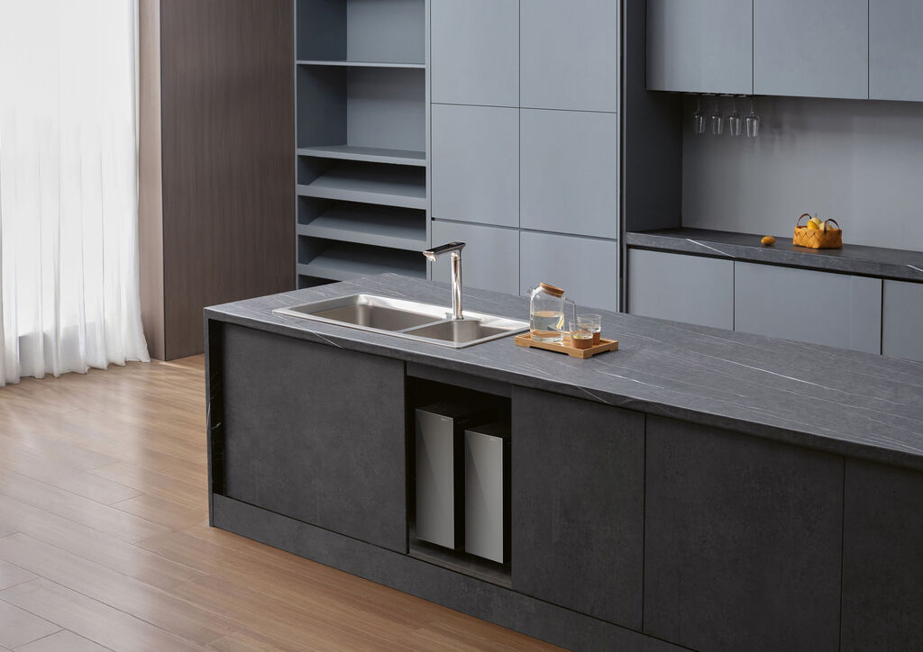 Hydrate One 2.0 is an under-counter water purification system with separate main and additional modules. Its clean lines, muted colours and champagne-coloured AG glass front allow it to blend seamlessly into modern kitchen environments. The tap is equipped with a large touch panel that controls all functions. The temperature can be set to nine different levels, from –3 to 98 degrees Celsius. A sparkling water function allows you to make your own drinks.