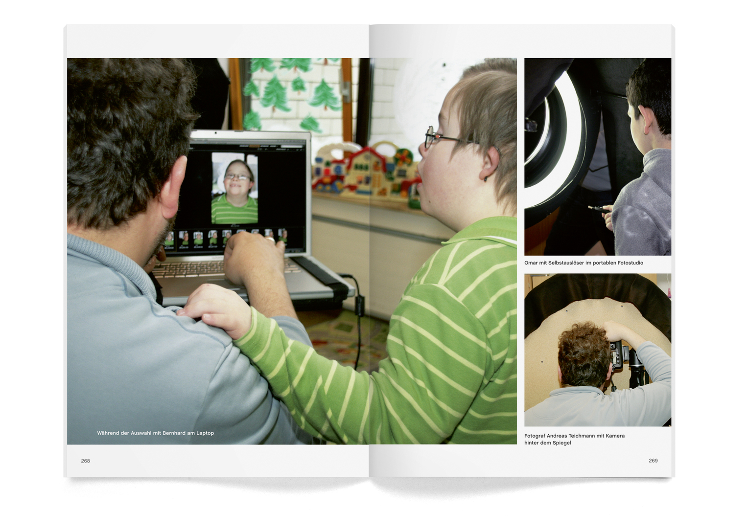 The exhibition catalogue “ich bin ich” (I am who I am) portrays 120 mentally and physically disabled pupils of the Comenius School in Essen, Germany. The many photographs on the 274 pages of the catalogue were shot by the pupils themselves. For this purpose, photographer A. Teichmann constructed a special mobile photo studio that allowed the children to see themselves in a mirror to take the self-portraits. The pupils were invited to take several portraits and then to choose their favourite one – the picture best reflecting their identity – for the exhibition. The catalogue documents the procedure of selecting the final photo and features statements by the children about themselves as quotes in cloud-shaped speech balloons.