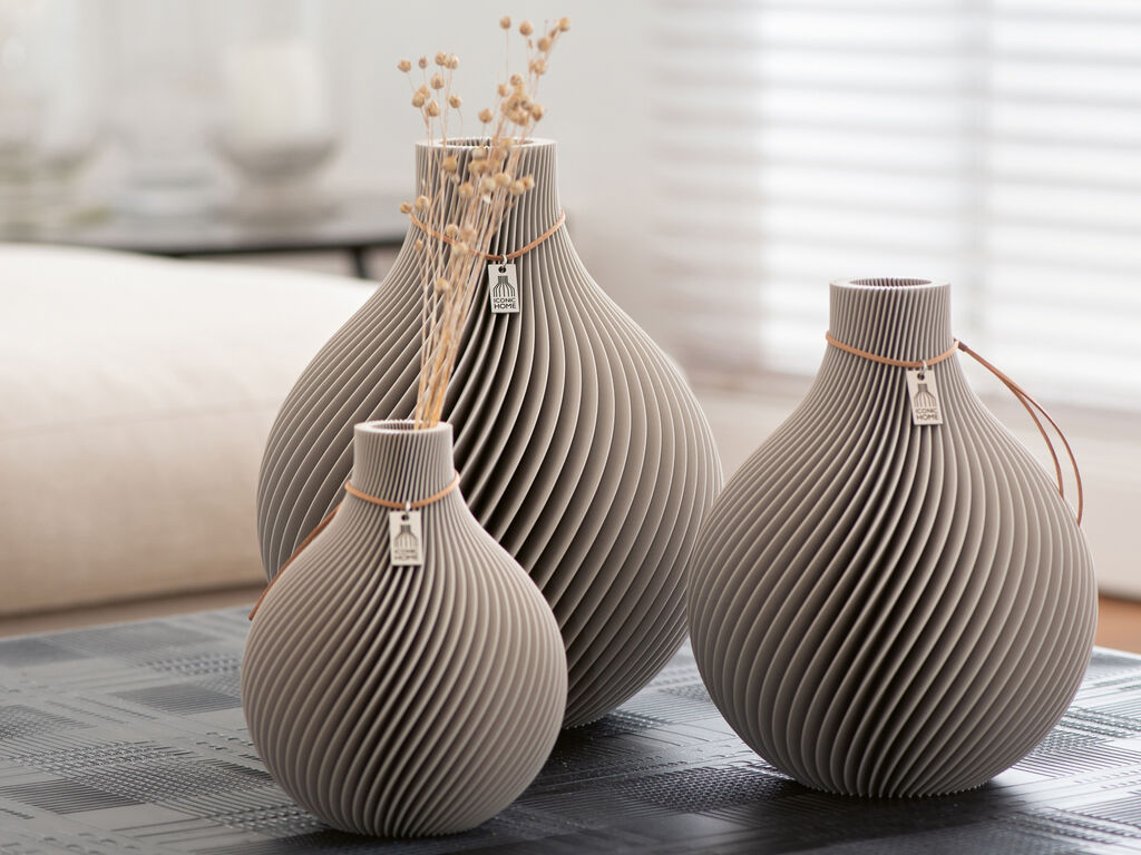 Light and shade redefined: the ICONIC HOME vases produce an extraordinary sense of depth. Depending on the viewing angle and incidence of light, the vases keep revealing new aspects of themselves, thus taking the concept of a classic smooth vase a creative step further. The five-part collection of vases is produced by means of an elaborate 3D printing process using bio-based plastic. Layer by layer, each vase takes shape in a manufacturing process that can take up to 15 hours – focusing on aesthetic precision as well as sustainability.