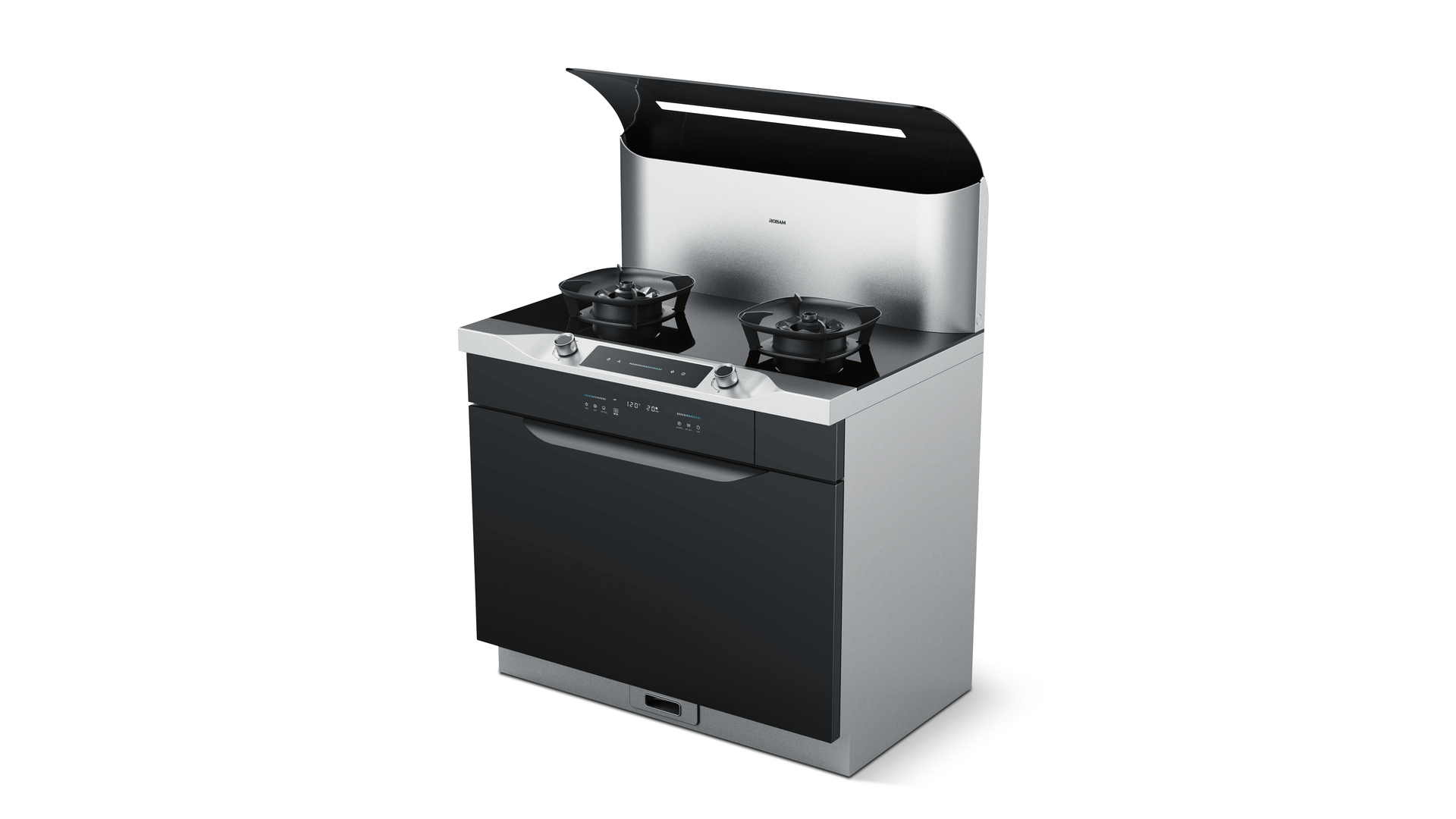 The Integrated stove 9QC03 unites the functionality of a gas cooker, steam oven and cooker hood. This allows different cooking processes to be carried out with hardly any effort. Special technical features include spiral-shaped 3D burners for different power levels and an efficient fume and grease separation system. In addition to the clean lines, the elegantly inclined cooker hood stands out, as does the control panel facing the user with its haptically appealing rotary knobs. The choice of materials and colours creates an appealing appearance.