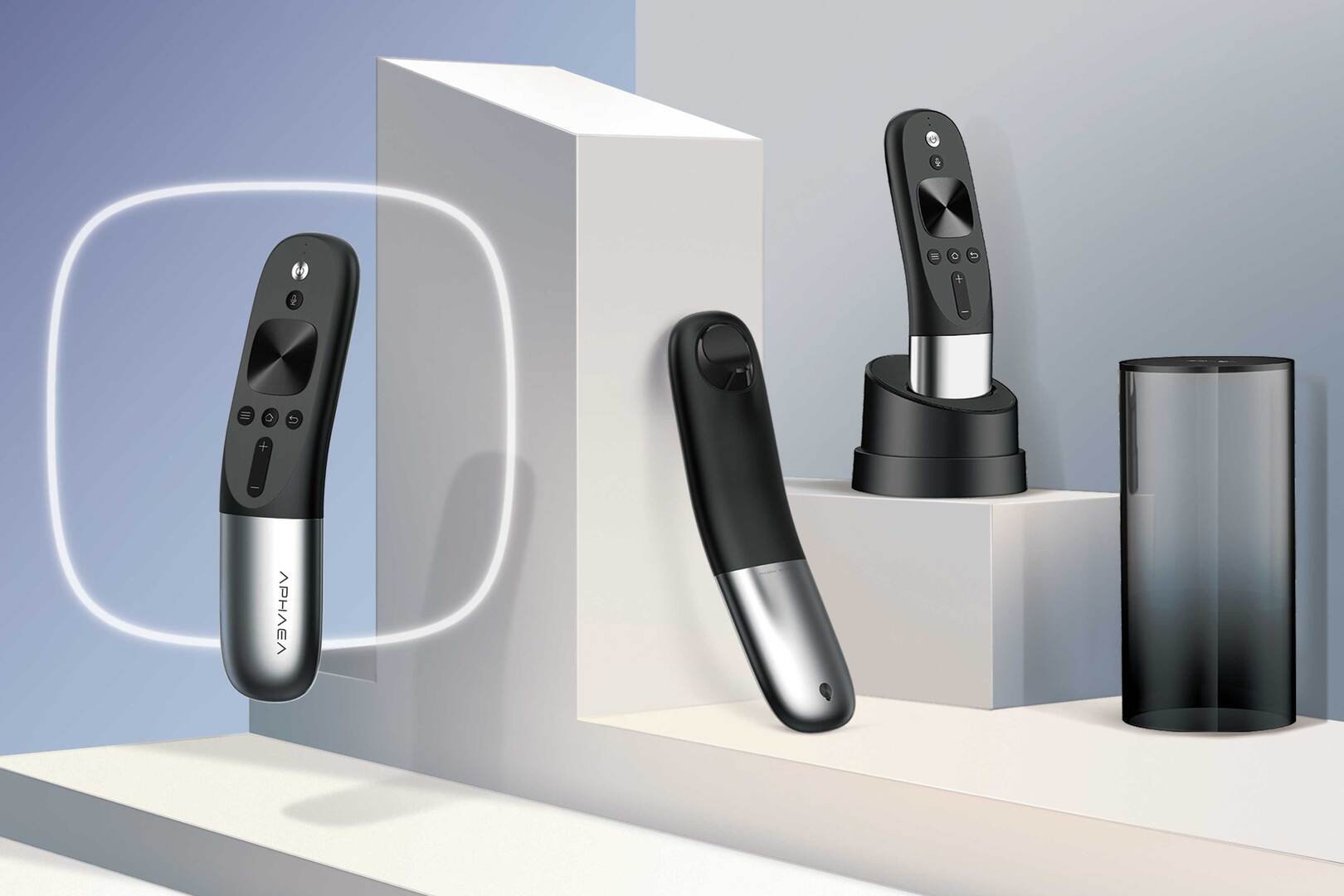The remote control detects slight wrist movements and allows the user to easily switch between applications. The minimalist and sleek key panel is made of various materials—the variation in material design and surface treatment of the key panel provides different tactile sensations, making them intuitive without distracting the user when using the controls. The charger’s base includes an infrared control hub system with voice activation to control other household AIoT appliances.