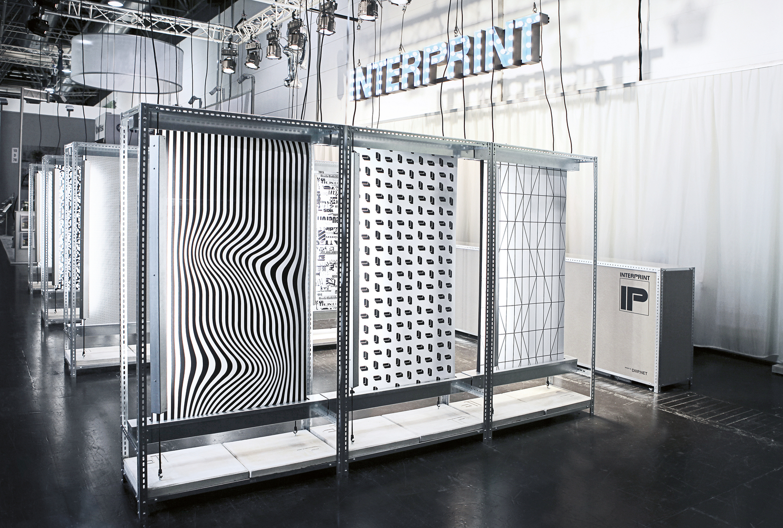 With its appearance at the EuroShop 2017, Düsseldorf, Germany, this pop-up trade stand promoted the brand Interprint to non-experts. Therefore, using only paper, rotation and graphics, an installation was created that symbolises a simplified printing process. Individual cabinets featured integrated rotating black-and-white graphics to evoke a warehouse-like character at the stand. The constantly shifting graphics cre-ated optical illusions that could be interactively experienced with the aid of templates and mobile phones.