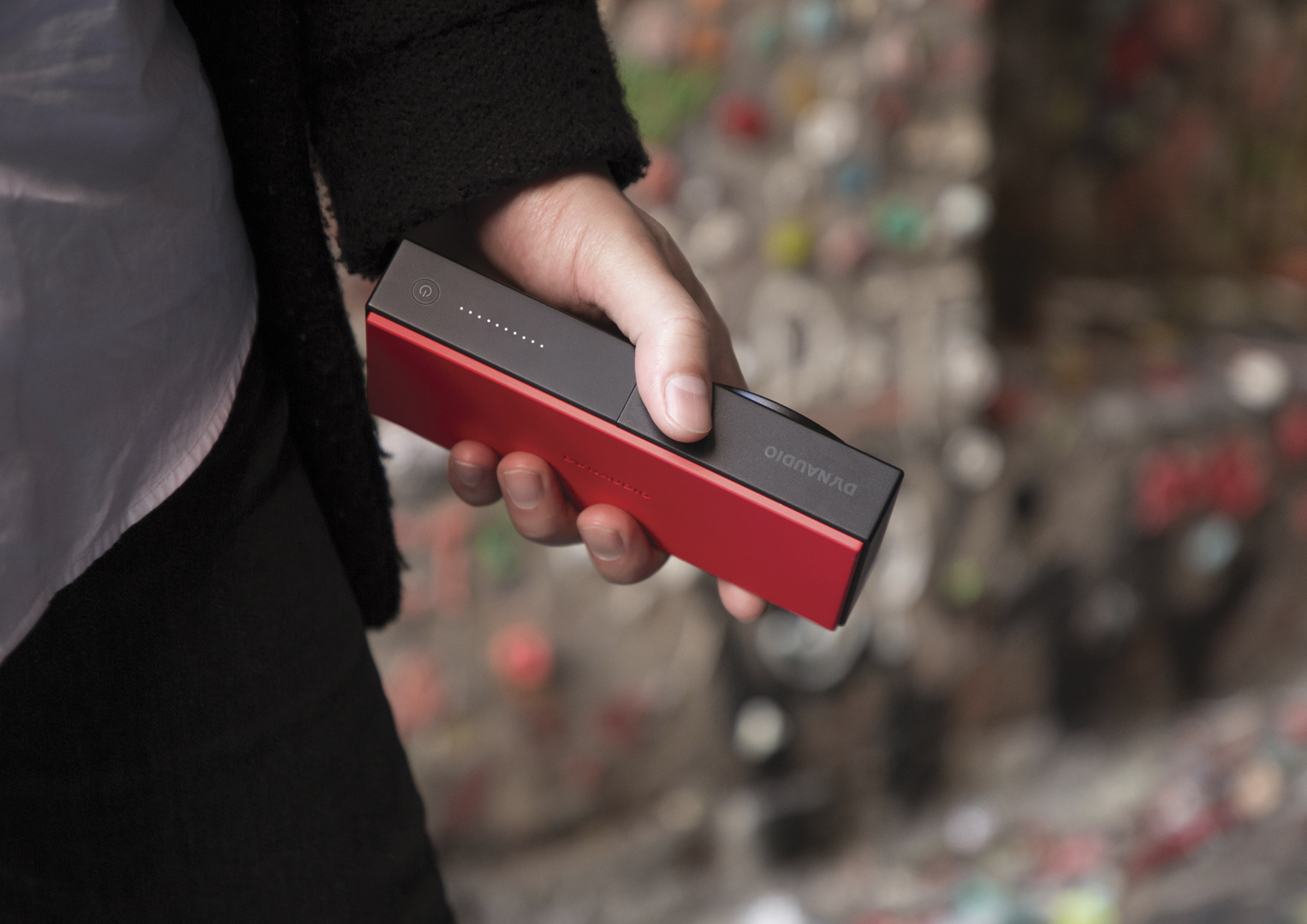 Whether this portable speaker is placed upright or lying down, its visually striking, clean, and masculine design offers a stunning pop of red on the foot and gives flair to its otherwise neutral pallet. A graceful fading pattern shows off the speaker grills and adds softness to the solid coloured front facade. This speaker can be a great accent accessory in your home or on-the-go.