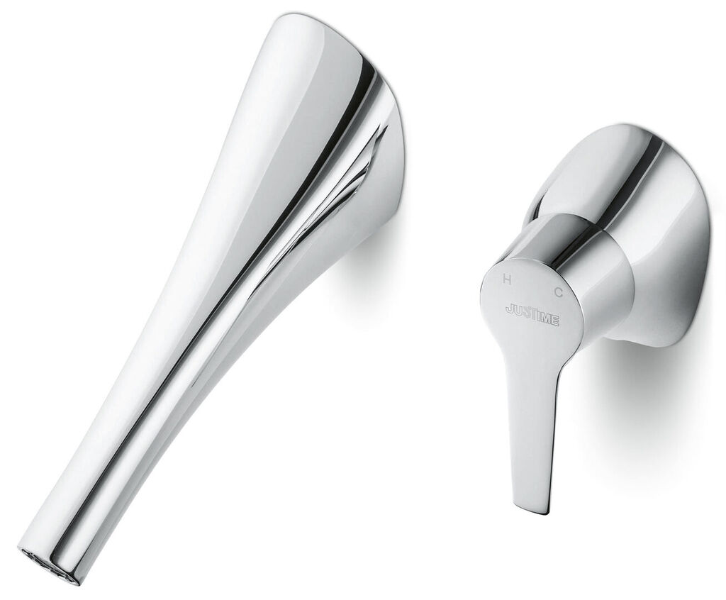 The conical body lends the washbasin mixer Justime an organic appearance. The side-mounted lever makes it easy to set the temperature and water flow. Due to its movable cartridge, Justime is also very easy to install. A special feature is that, even after installation into the wall, the position of the faucet can still be adjusted and the cartridge be pulled out or pushed in by up to 35 mm.