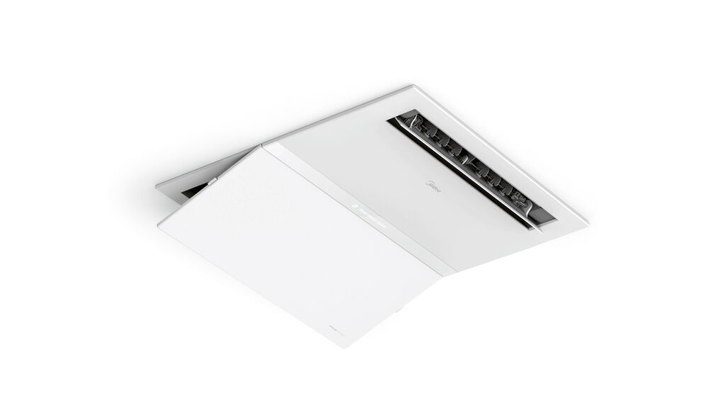 K100 is an air conditioning unit for kitchens that works on the recirculation principle and is part of a centralised air conditioning system. The air is drawn in via the return air opening with removable filter, tempered and then distributed evenly throughout the room via the 3D outlet. When not in use, both openings are completely closed, which prevents deposits from building up inside. The square device with rounded edges can be integrated flush into the ceiling and its matt white surface is easy to clean thanks to its anti-grease coating.