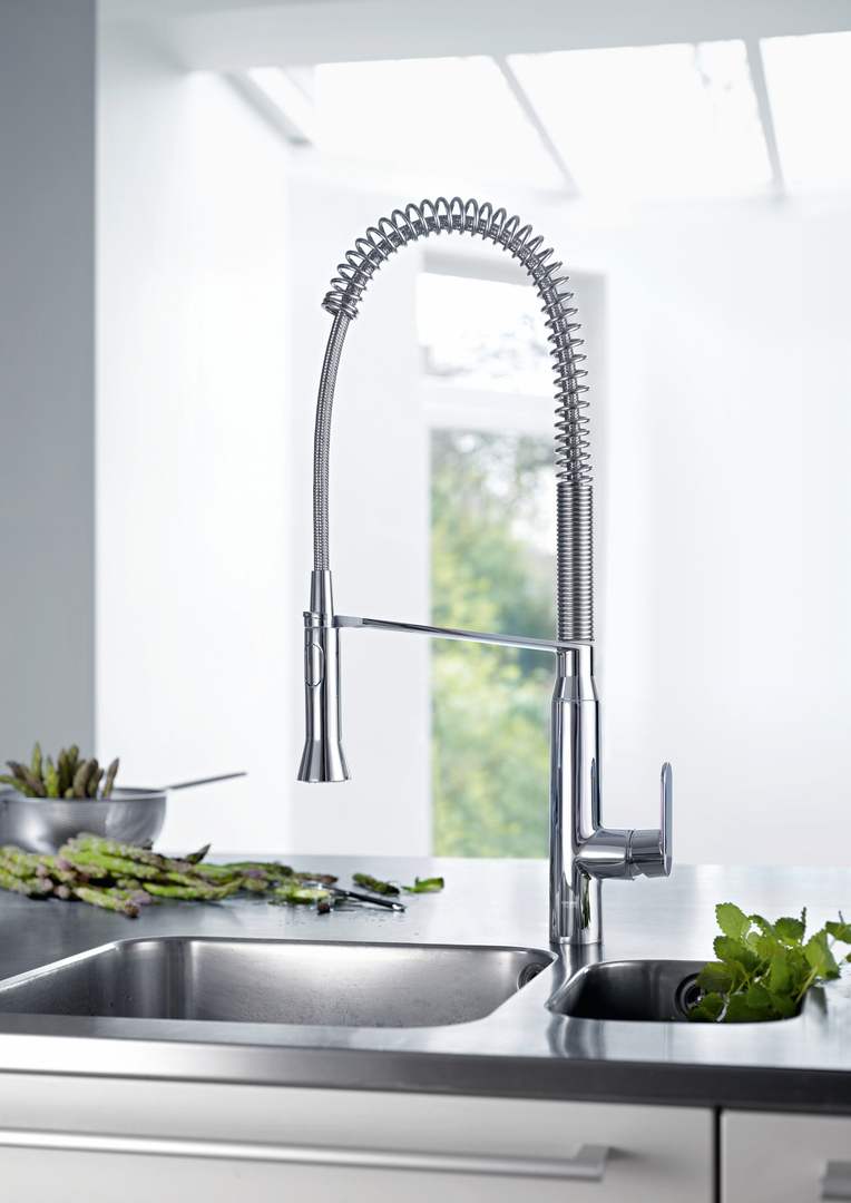 The seven main components of this modular kitchen system follow a stringent aesthetics and can be individually combined. More than ten different product solutions can be obtained from the modular designed product range – from various types of two-hole single-lever mixers to a professional one-hole system. The professional tap shown in the picture offers high functionality and comfortable flexibility. The spiral reinforced water hose has a striking look; it can be loosened from its fastening. A practical diverter on the shower head allows to switch quickly between a laminar flow and a fine spray, which is recommended for example for rinsing fruit. Each outlet was positioned in a fixed height and inclined at an angle of seven degrees. The attractive form language of the taps communicates stability and durability; it also is to visually enhance the overall image of a modern kitchen.