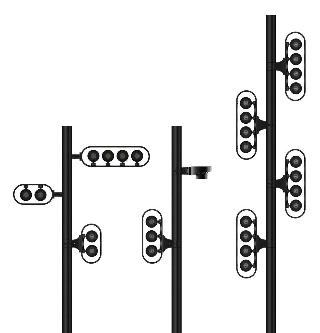 L07B is designed to be freely combined with two to four luminaires. It dissipates heat with ‘shark fins’, and every 100mm in diameter produces 20W (CRI>95, R9>95) illumination. Each luminaire has an integrated hoop and is connected by Cardan joint, allowing the supporting pole to rotate 360° in both horizontal and vertical directions.