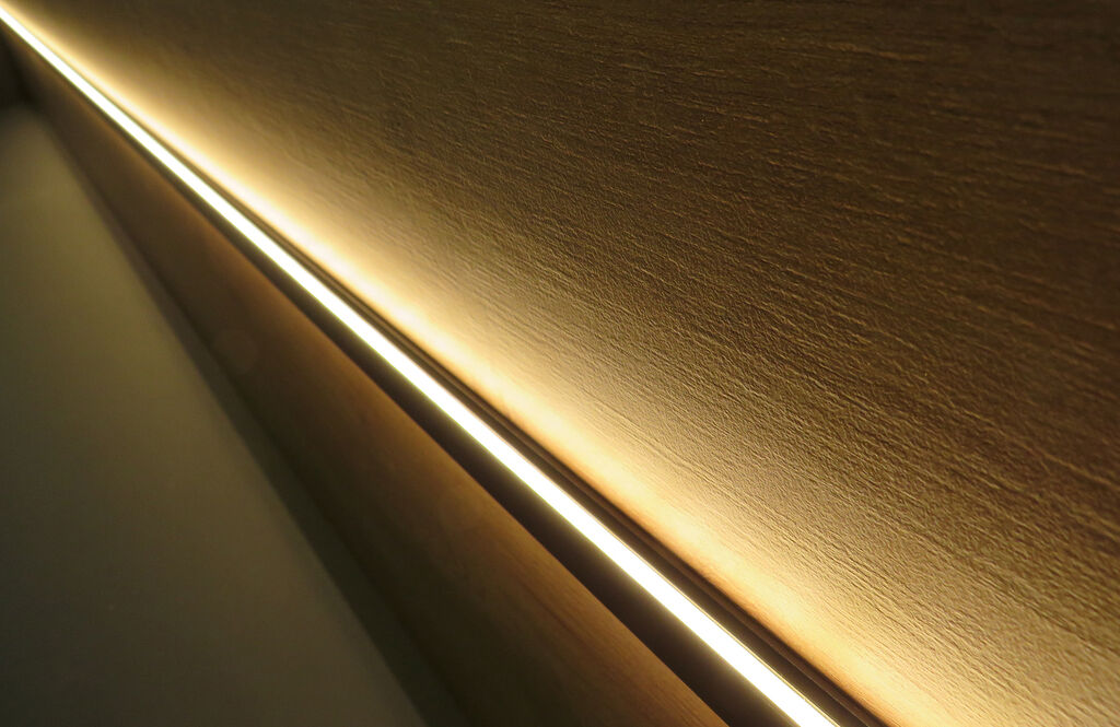 Created specifically for niches, the exquisitely elegant LD8177 lighting system can be easily complemented with additional elements such as shelves or brackets. A strip of small, tightly spaced LEDs provides homogeneous, indirect and glare-free lighting. Different versions with light that radiates downwards, upwards or backwards create an atmospheric ambience. The design concept fits to typical furniture layouts. The lights are easy to install, with cable routing at the rear.
