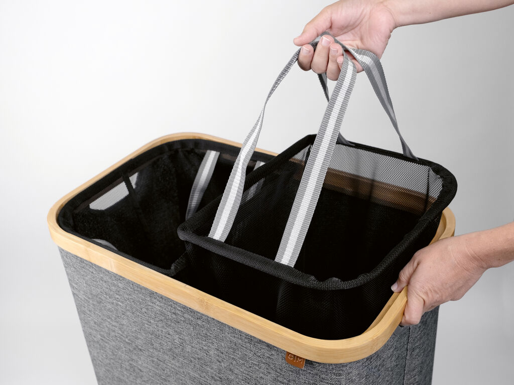 The Double Lidded Hamper LUXE makes it easier to pre-sort dirty laundry. Two removable mesh bags ensure the easy transfer of the laundry to the machine. They are held in place by an FSC-certified bamboo frame in the basket, which also acts as a handle for carrying the laundry basket. Assembly and disassembly are intuitive and can be carried out without tools. Foldable fibreglass rods concealed inside the basket ensure space-saving storage. Furthermore, the mix of materials creates an exciting dynamic.