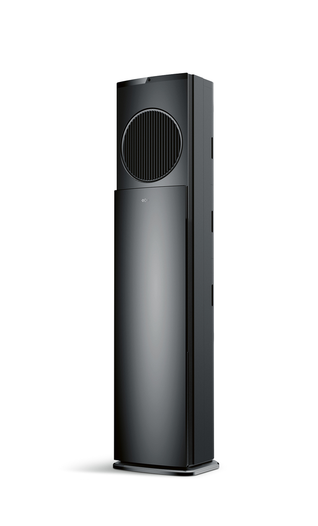 The defining design element of this floor-standing air conditioner is the circular air outlet. It is concealed behind the matte black movable front that is pushed downwards to turn on the device. In addition, the air conditioner releases air from two side outlets, delivering a well-balanced ventilation of rooms. The direction of the air flow can be controlled individually, which helps prevent cool air being blown directly at people in a room.