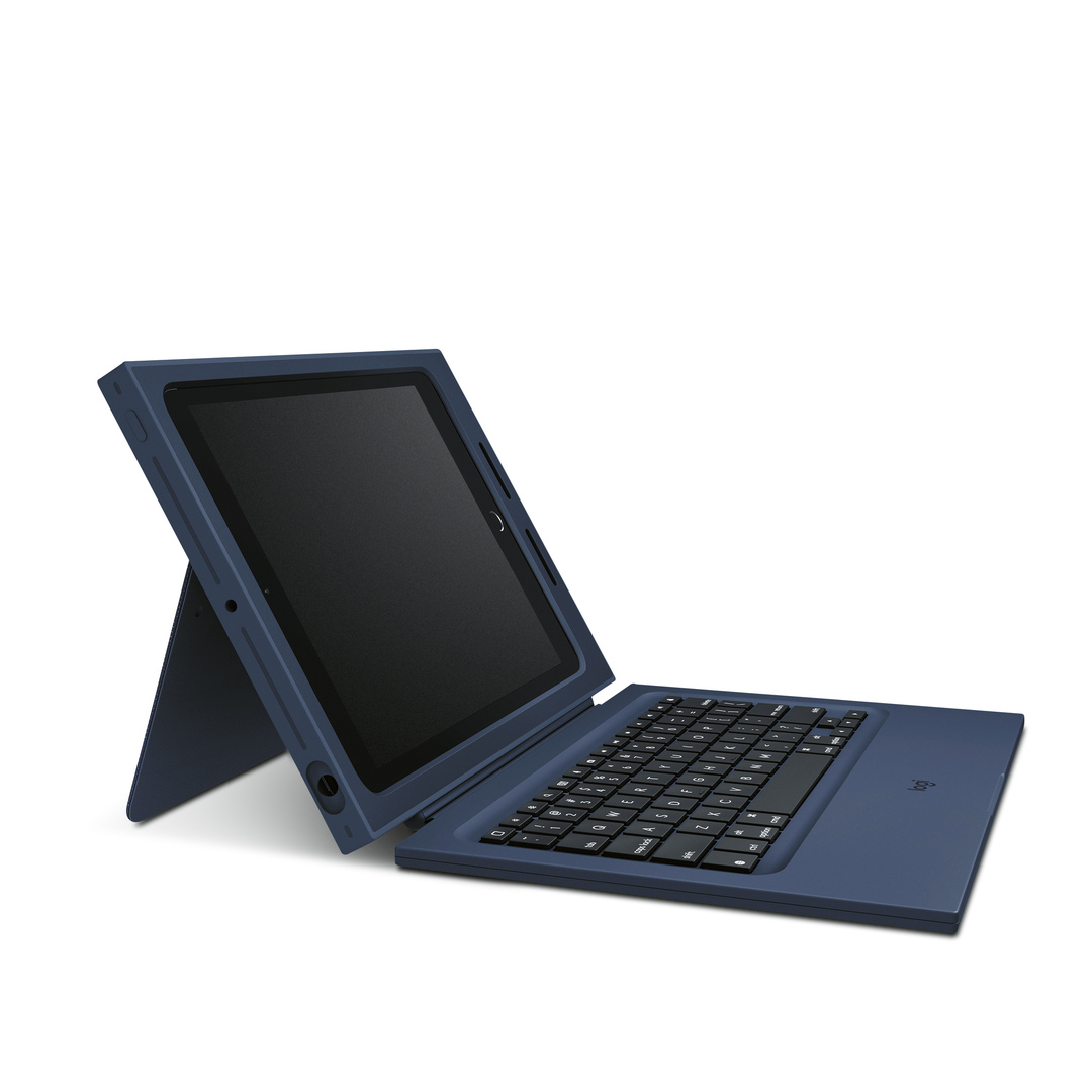 The Logitech Rugged Combo was specially developed for use in classrooms. The detachable keyboard of the iPad case creates a typing sensation similar to that of a laptop. The frame is reinforced with polymer ribs, absorbing impact and protecting the device in case of dropping. The fold-back holder with stable hinges can be adjusted freely within a 40 degree range. Direct connection to the iPad provides a secure solution during tests. Power is supplied directly via the tablet.