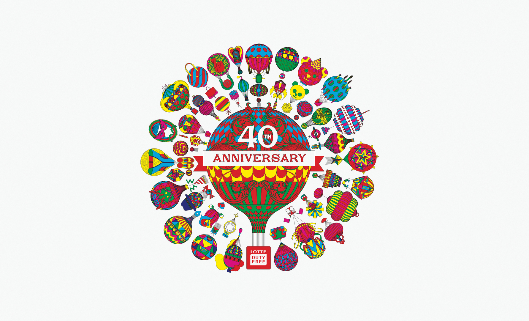 This brand promotion was developed for the 40th anniversary of LOTTE Duty Free, a large duty-free retailer on the Asian Pacific market. A range of colourful key visuals feature across the entire campaign, including printed and digital communications. They all share the same association with a rising hot-air balloon, used as a symbol of future projects. The motifs are also used throughout in-store graphics and on the product range. The vivid design language represents the celebration of 40 years of history and aims to appeal to a wide target group.