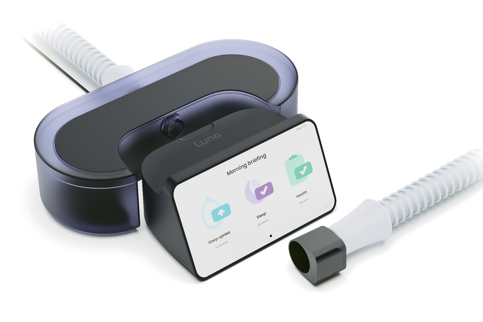 Luno helps patients manage obstructive sleep apnea by monitoring their health and providing guidance and support. It takes a comprehensive approach to therapy and includes night-time breathing support, better adherence, weight and lifestyle management, and a cardiovascular disease monitor. The system consists of a CPAP device, a sensor and an interface that, when used together, provide a comprehensive picture of the user’s health and needs.