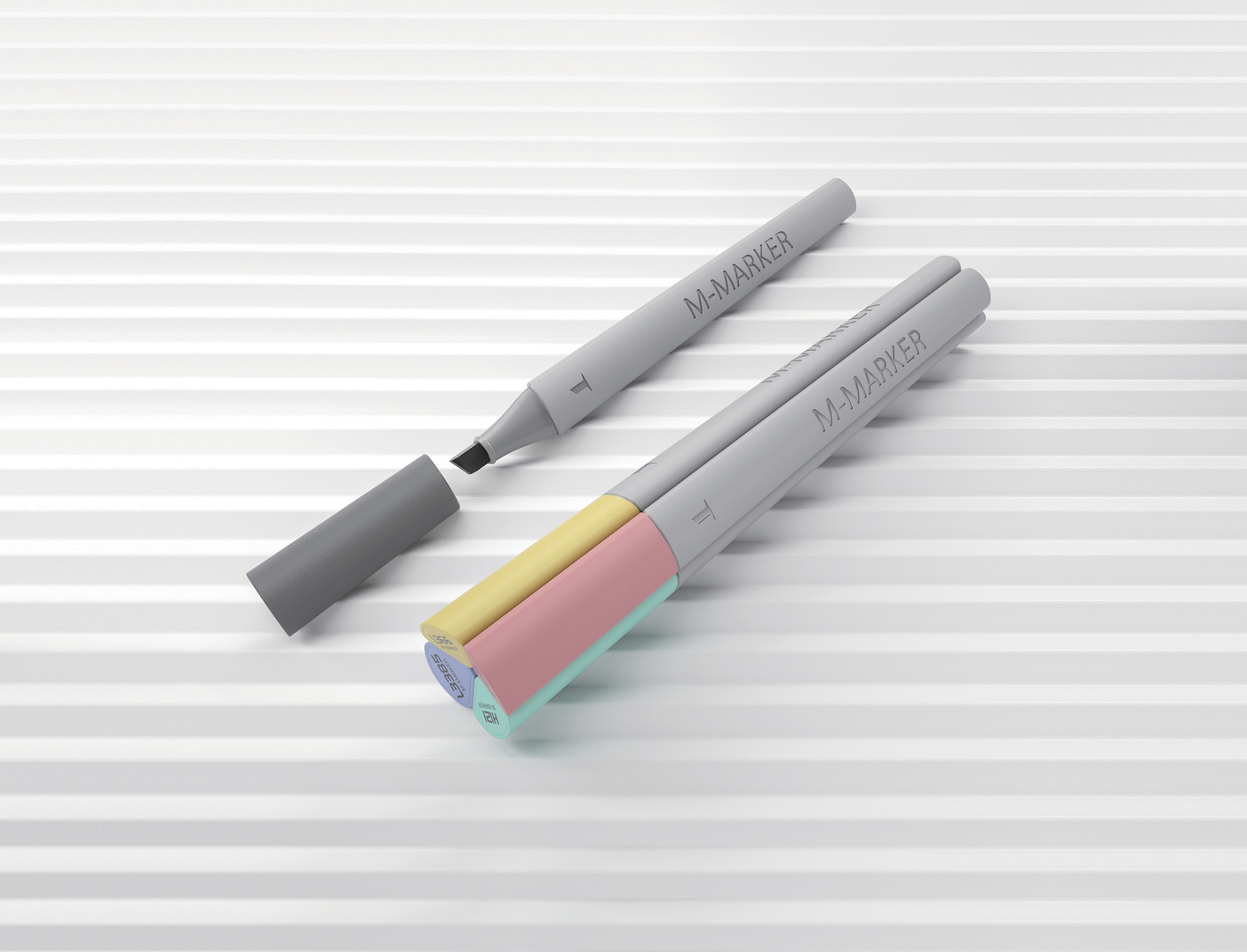 It usually takes three to four markers to blend a sequence of colours, but constantly sorting and categorising markers can interrupt the creative process. M-MARKER provides a solution. With a magnetic marker packaging and a quadrant-shaped body, users can easily combine four markers. Not only is this convenient for colour classification and grouping, but the design also makes it easy to keep groups of markers together for the next use. In addition, the markers' ergonomic form makes it more comfortable to grip. Red Dot Award: Design Concept | Concept | Workplace