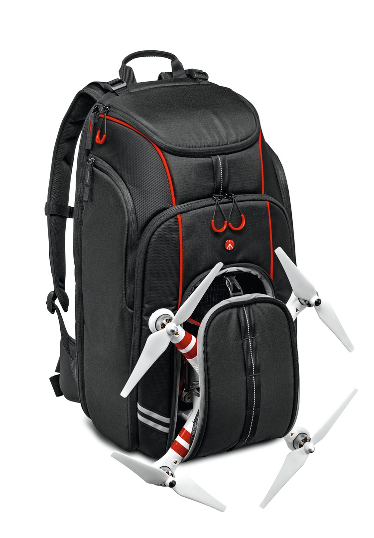 The Manfrotto D1 drone backpack was developed specifically to transport photo drones. The internal compartments offer space for a quadcopter and its remote control, a DSLR camera with the full complement of accessories and a laptop. In addition, it can also accommodate a fully assembled drone with propellers. The drone does not need to be taken apart for transport saving the pilot valuable time when moving between locations. A rain cover and external tripod fixing points complete Manfrotto D1’s features.