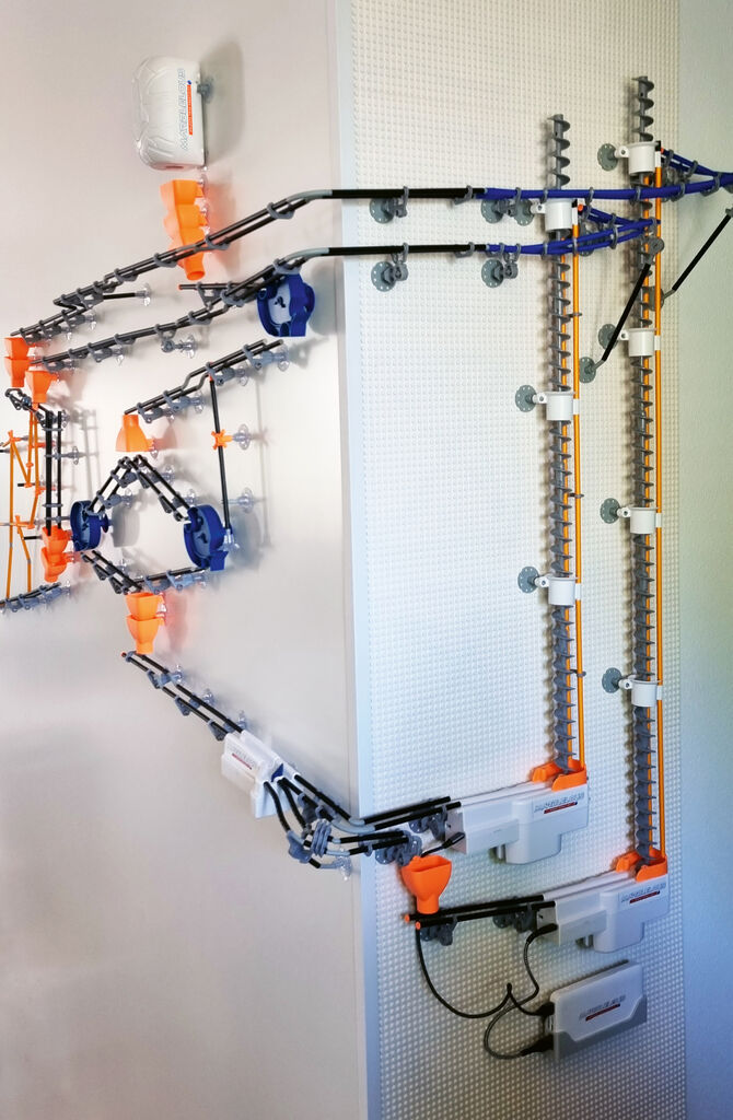 Marblelous is an interactive marble run that combines sophisticated high-tech tricks with traditional gravity fun. Tracks, connecting pieces and switches, but also everyday materials such as straws or Lego bricks are used to create ever-new constructions. Additional smart tricks that can be controlled via app, e.g. for light, sound or endless loops, provide even more fun. Marblelous can be used on vertical surfaces such as windows, mirrors or kitchen cabinets, but also in the garden or sandpit, for example.