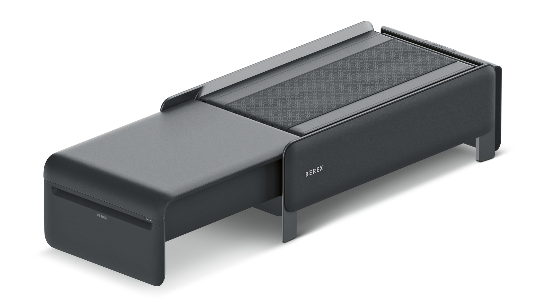 The Massage Bed was designed in consideration of the type of environment for which it was intended: the home. As a result, it boasts the aesthetic of a piece of home furniture and integrates well into living spaces. The convenient pull-out mechanism allows for more compact dimensions, while the rounded edges, matt-black surface and slender legs contribute to an elegant appearance.
