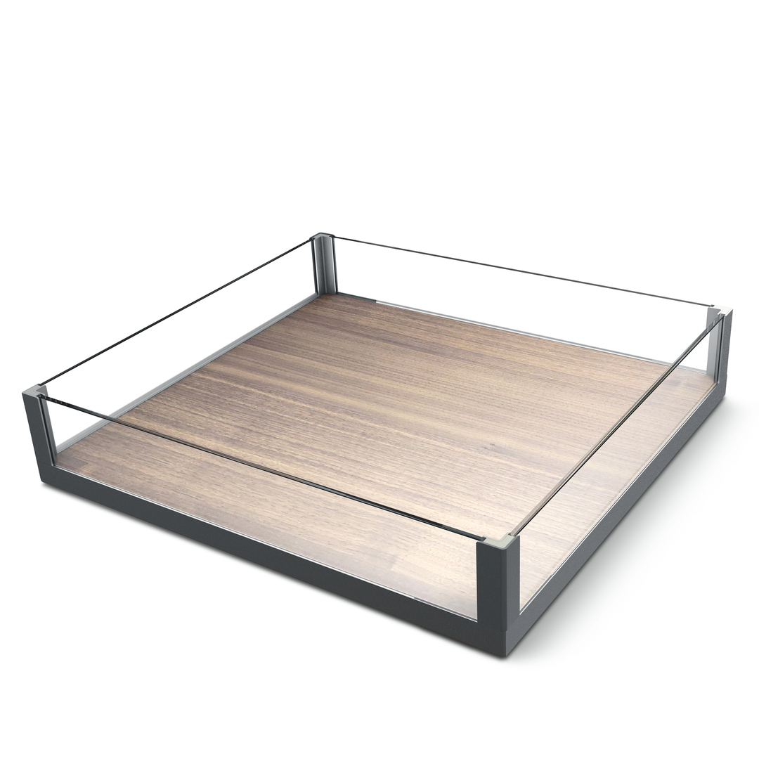 The Matrix Flex drawer system has a flexible metal frame. Different boards are simply inserted into this frame and the corner elements are then stuck in. This concept allows for assembly with only a few components and minimal effort. The functional features of the drawer system are underlined by a filigree and clean look. The system can be set up in a variety of ways thanks to the different materials and combinations.