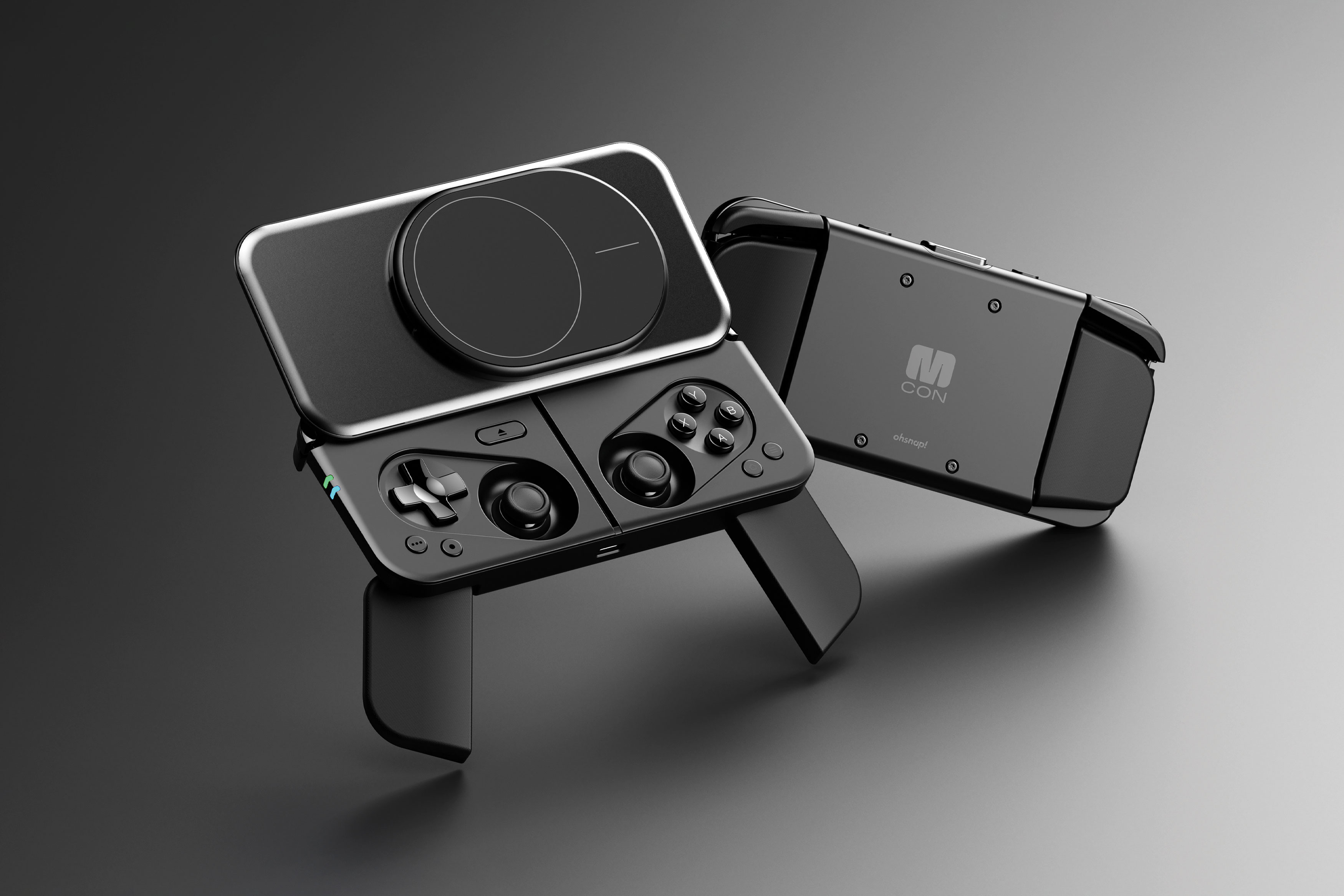 The OhSnap MCON is a compact, magnetically mounting wireless smartphone controller that solves issues of bulk, poor connectivity, and pocketability. Its button-operated auto-launch mechanism reveals a gamepad and phone mount, emulating classic handhelds. Full-sized TMR joysticks, hall-effect triggers, and ergonomic flip-out handles provide a console-like experience. A removable top plate acts as a kickstand, and a dock enables TV streaming.