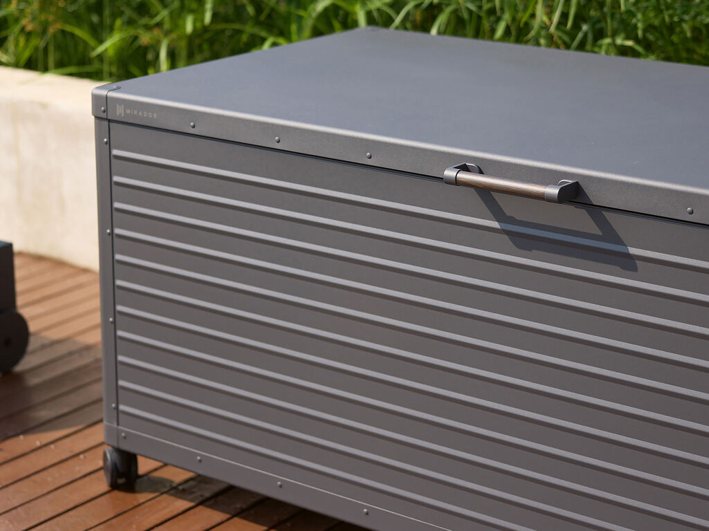 Made of galvanised steel and aluminium, the Mirador Storage Box is a weatherproof storage solution for the garden. Its clean, minimalist design complements any modern garden, while its integrated wheels make it easy to move. The robust box retains its shape and colour – even when exposed to intense sunlight. A soft-closing lid protects the contents and prevents fingers from getting pinched. Designed for both durability and sustainability, the box is suitable for long-term outdoor use.