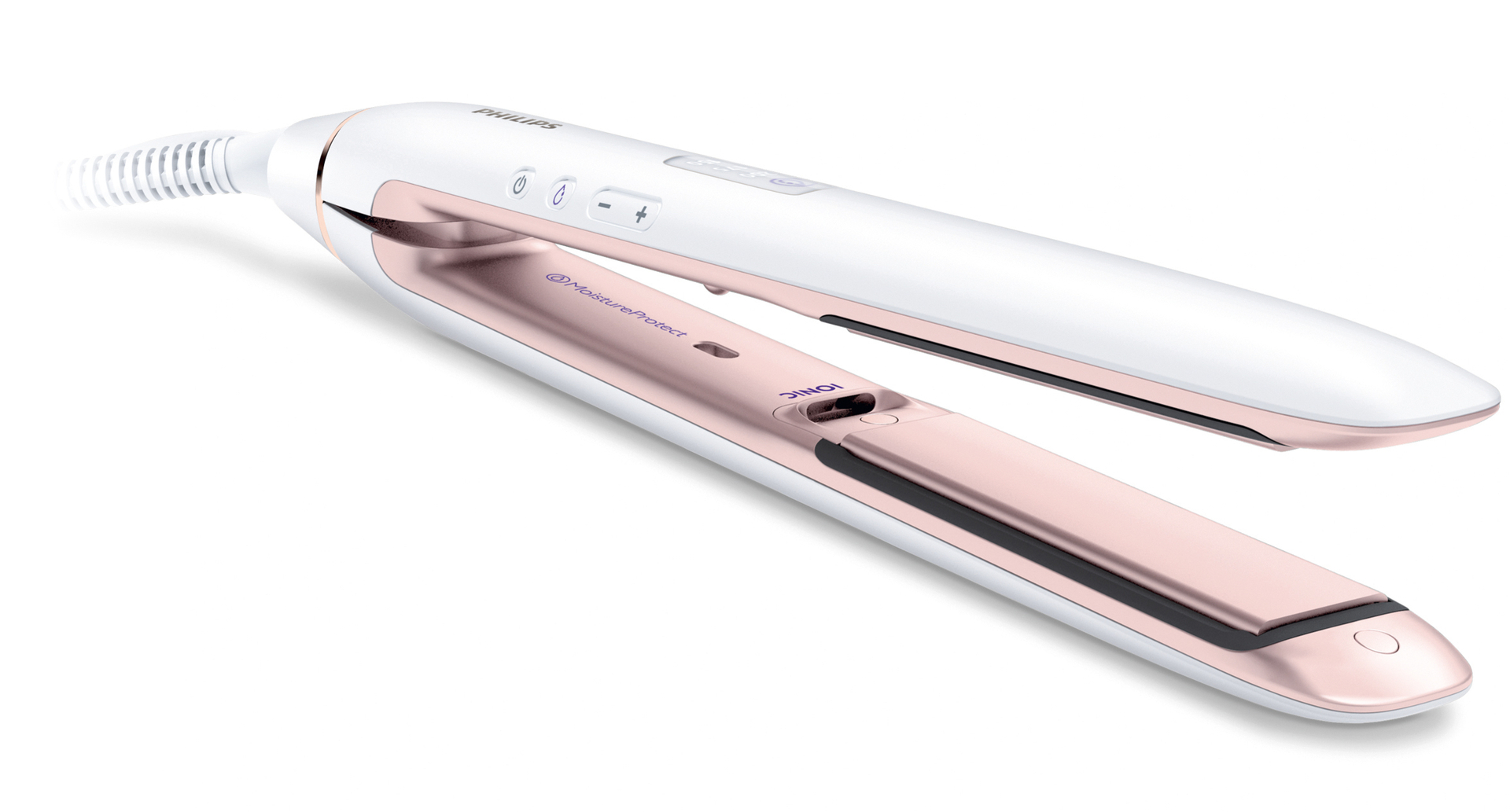 The hair straightener MoistureProtect ensures smooth styling without drying out the hair unnecessarily. An innovative sensor controls the heat and thus maintains the natural hair moisture. Elastic ceramic plates apply slight pressure reducing the risk of hair breakage. An ionisation feature prevents electrostatic charge. Its reduced design with a hidden hinge and self-explanatory functions makes the device visually appealing.
