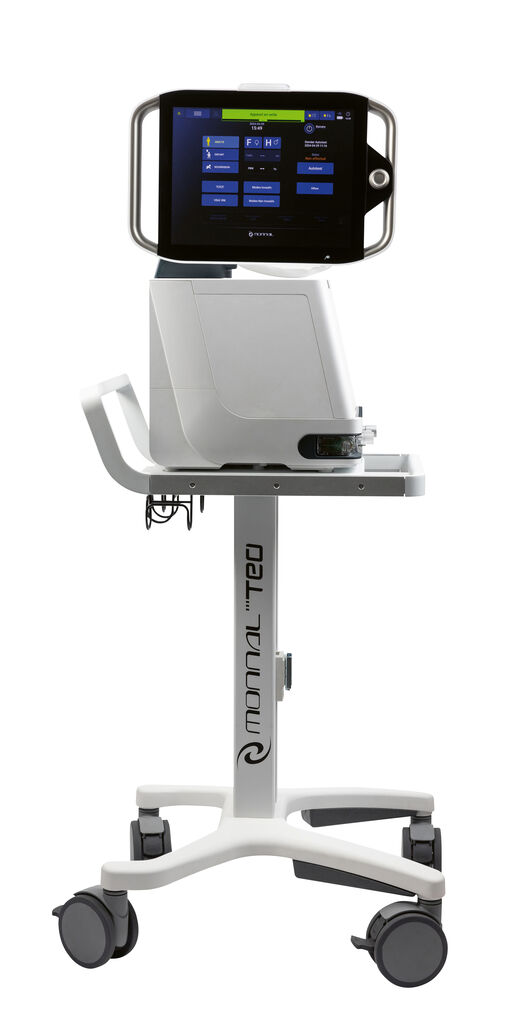 Monnal TEO is a ventilator for the intensive care unit. The user interface of the 15" capacitive touchscreen uses a dark colour scheme to improve the visibility and contrast of ventilation curves and clinical values, while a prominent alarm indicator is easy to notice even from a distance. A clearly structured connection area in grey simplifies the handling of external devices. The minimalist design with rounded housing edges characterises the professional appearance.