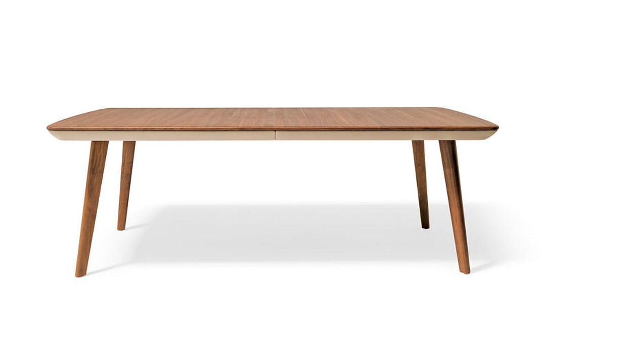 Derived from the traditional craft of making old farm tables, mylon conveys a powerful presence. The flush set base and the tapered legs, which merge flowingly into the frames, as well as the rounded outer edges characterise its silhouette. A three-layer technology enables the slim design of the table top and the transverse orientation of its wood grain. The table is available in various sizes, different types of wood and in an extendable as well as a non-extendable version.