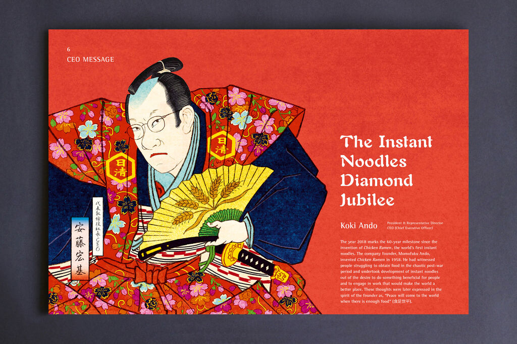 In order to mark the 60th anniversary of the invention of Japanese instant noodles, NISSIN FOODS celebrates its contribution to food culture in the 2018 annual report. As a metaphor for cul-tural influence, the design concept utilises the illustration style of ukiyo-e woodblock prints, which inspired the Impressionists. The cover unfolds in a zig-zag manner, revealing richly illustrated topics introducing the report theme. The combination of traditional and contemporary elements conveys Japanese and international flair at the same time. On the inside, readers are surprised by features such as executives illustrated as kabuki actors.