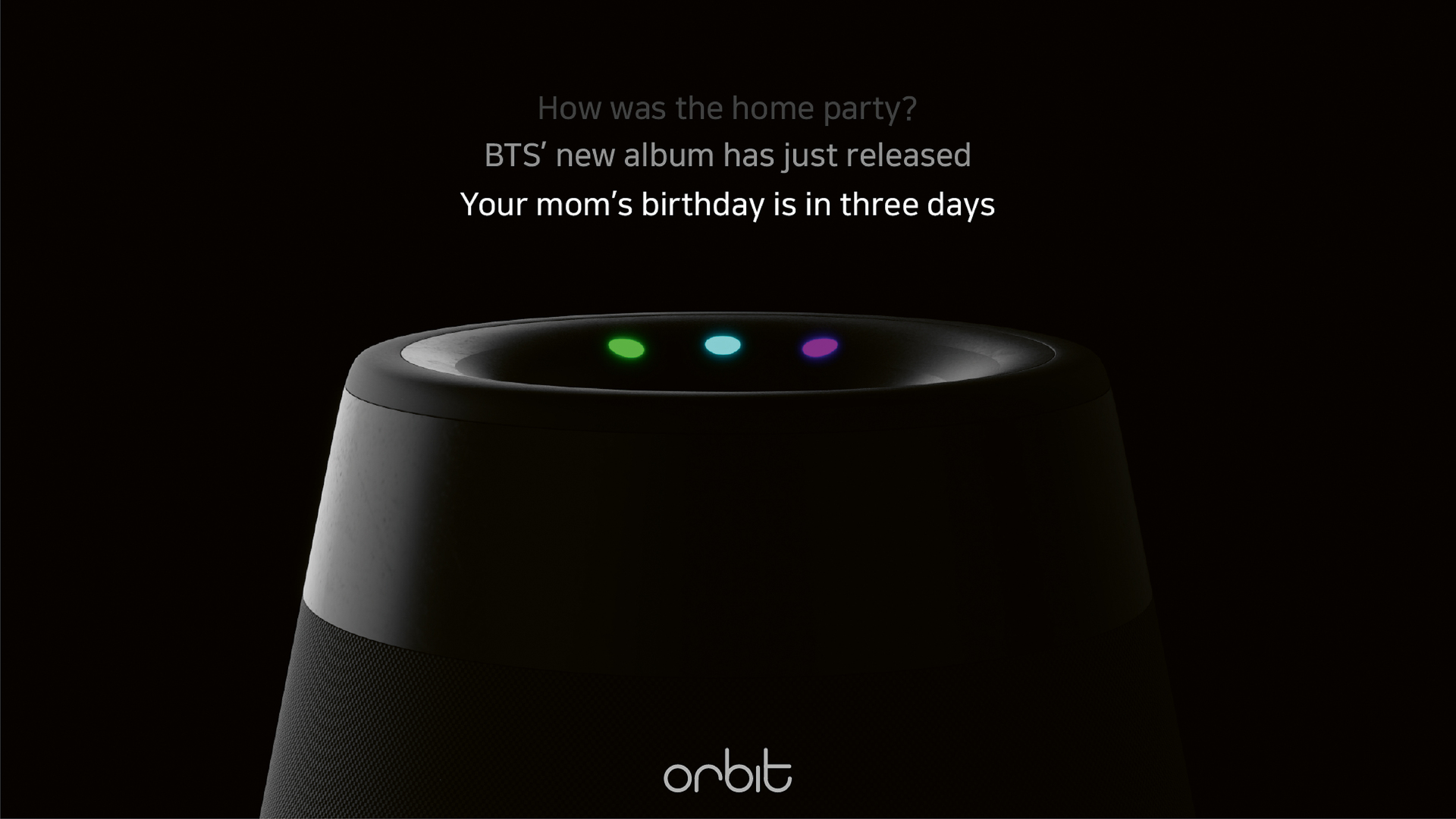 The Orbit smart speaker provides users with a natural communication experience, since it does not need a wake-up command to start a conversation, but by itself shows the will to communicate. The device uses LED lights to indicate that it has valuable information to share. If the user is not nearby at that moment, the information is stored, with an LED stack light circling around the top of the speaker to express that it is “waiting” for the user. The LED colours indicate what kind of information is available: blue is for daily life issues, green for user interests and purple stands for calendar-related content.