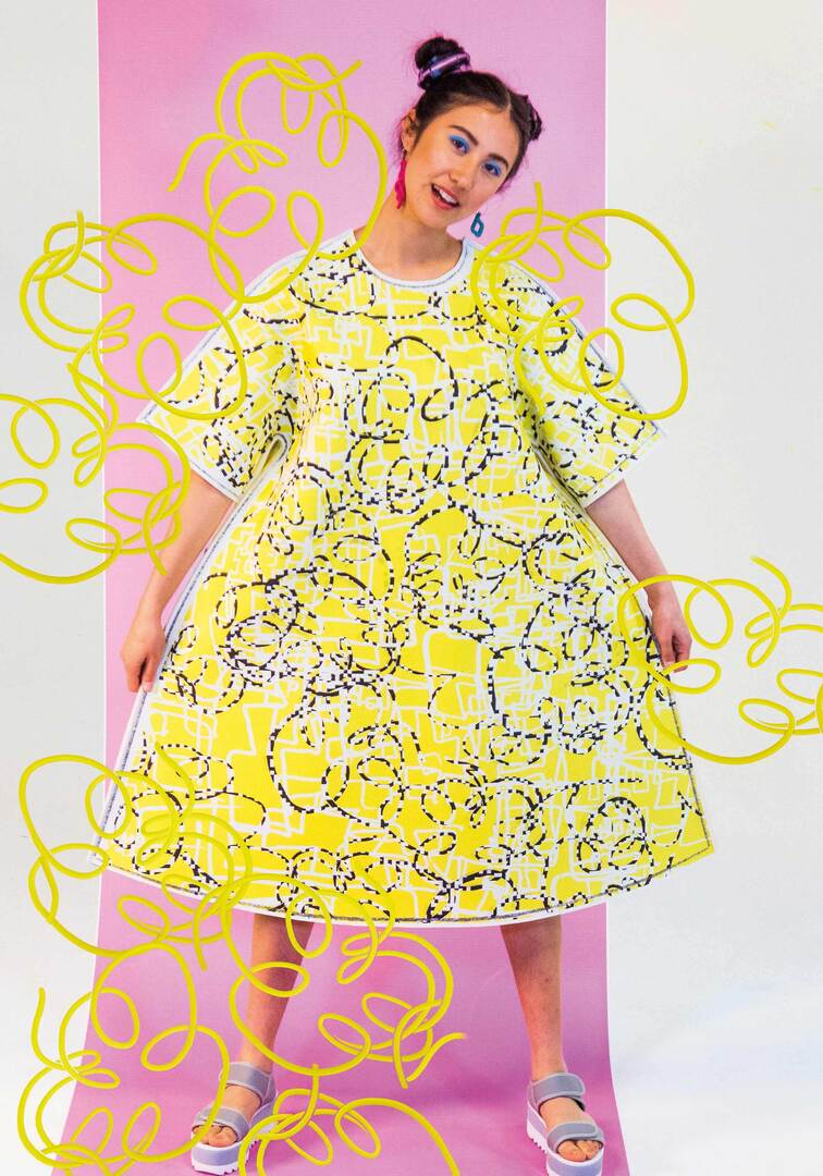 Out of Bounds uses a form of ‘play’ based on a 2D and 3D visual narratives, and employs an abstract interpretation of the make-believe space to transition it from playground to screen. Digital print and embroidery illustrate multiple levels of immersion in both digital and make-believe spaces. The textile patterns on Out of Bounds are designed using a Google Tilt Brush, allowing the designer to use the digital world as a portal to make-believe worlds. The textile patterns are then turned into a collection of dress-up garments, purposefully oversized to evoke a greater sense of play.