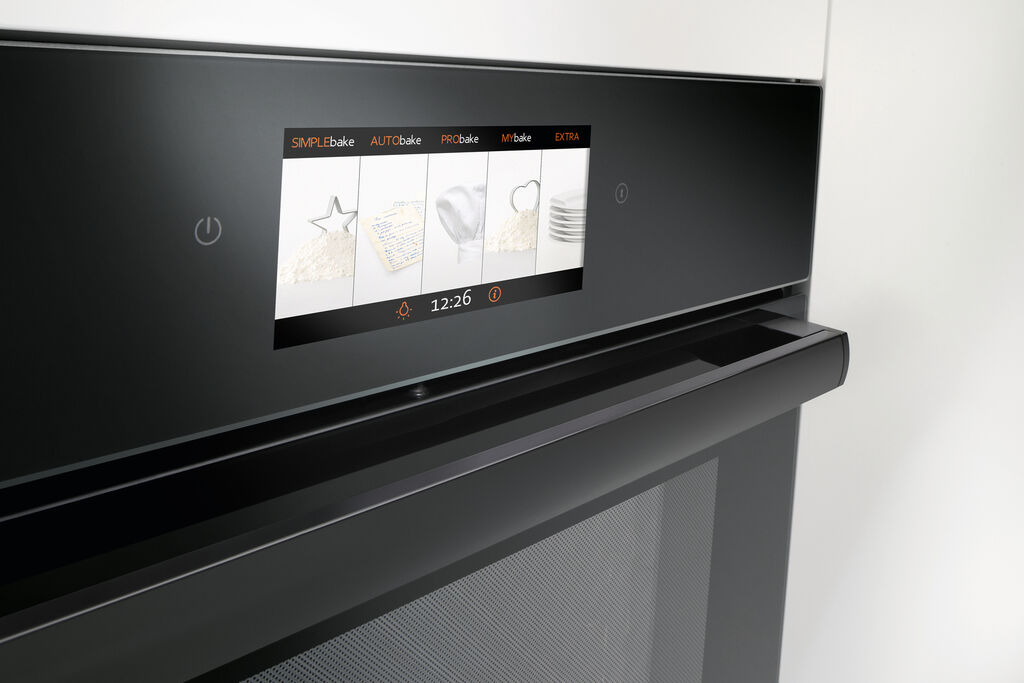 In the design of this built-in oven, a complex technology has been translated into a user-friendly operating interface. The type of food is selected directly on the colour display, which provides a clear view of the contents. The oven meets the expectations and the level of knowledge of any user allowing a choice of different control modes. The Simplebake and Autobake programmes are intended for those who want to prepare a quick meal and have little knowledge of food preparation. In the Probake mode, the user can set all roasting parameters. Stepbake allows roasting in several steps thus achieving better results. With Mybake own recipes can be created.