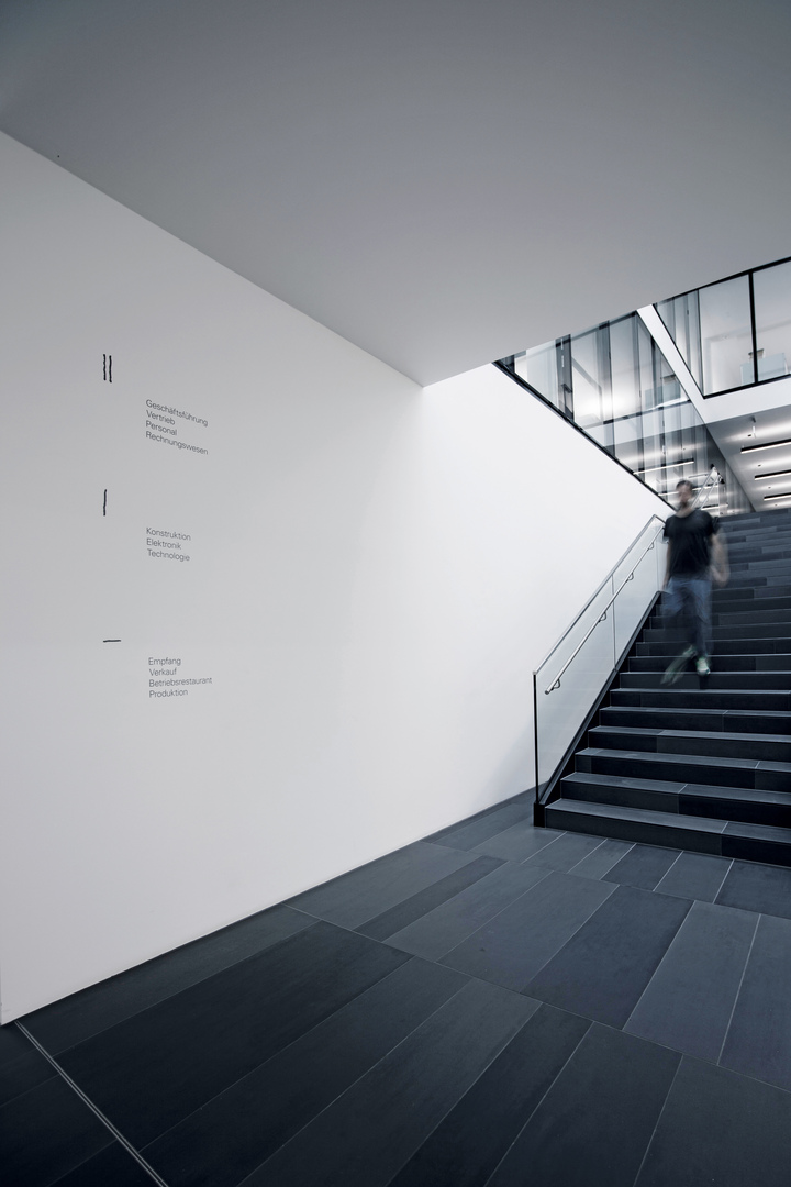 The spatial graphics and orientation system “Annäherung” (approach) was designed as a fractal journey through the corporate culture of Philipp Hafner to visualise their working methods embodying the permanent optimisation in production measurement technology. Handcrafted drawings serve to illustrate the smallest measurable entities. Therefore, minimal deviations, based on a 0.05-mm line width, were applied to the walls, enlarged by a factor of 20. The spaces between the parallel lines are also aimed at evoking a constant yet never-repeating state of flux between extreme densification and large free spaces.