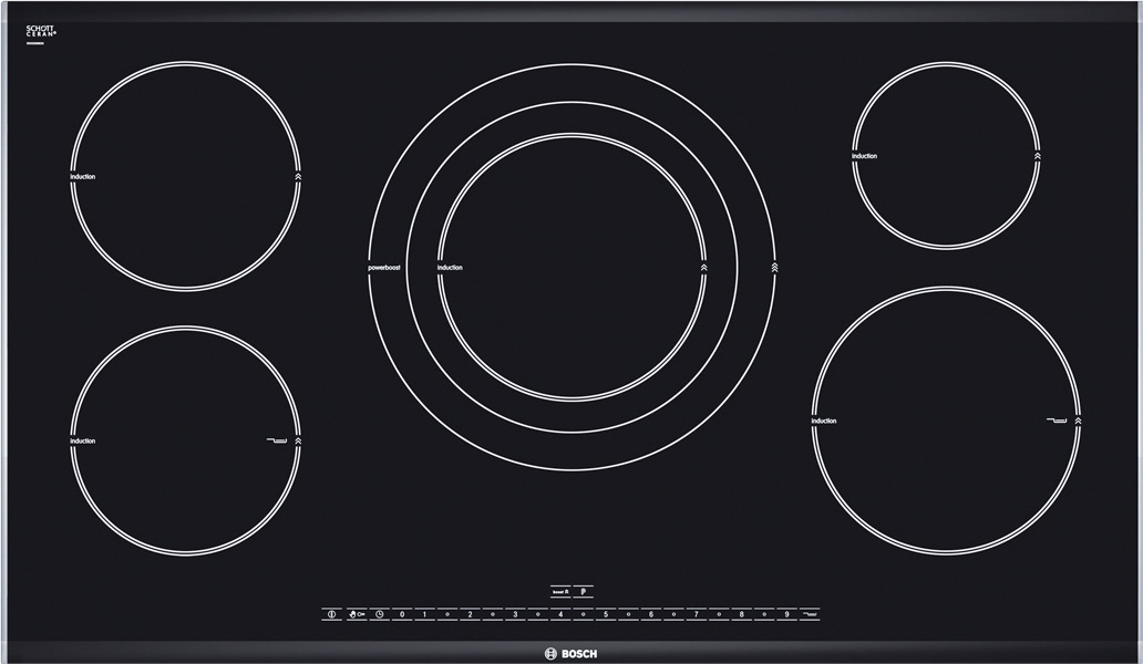 The discreet graphic pattern and the bevelled ceramic glass enhance the generosity of the energy efficient induction hob. Flush-mount metal strips at the sides and underneath the front edge ensure optimum edge protection and easy cleaning. The newly developed DirectSelect touch control interface allows for the direct selection of the desired heat settings via a linear ten-key pad.