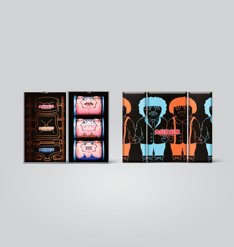 Pork Floss for Hulk is rich in protein and minerals and is made for sports and fitness enthusiasts. The packaging design for this canned food is both eye-catching and cost-effective. Three humorous characters with fitness clothes and dumbbells were developed for this. The illustrations, which fit the curved surface of the cans, are divided into three parts so that one tin shows the head, another one the torso and a third tin the lower body. Three of them placed on top of each other in an outer packaging thus create the image of a complete figure.