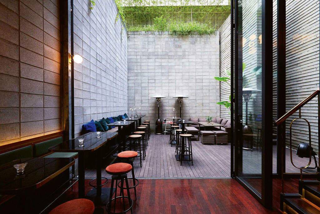 Pussyfoot Saloon was originally inspired by the 1920s; reviving the charm of illegal bars during Prohibition. To avoid just reproducing a bar from that period, the idea of creating a bar in a train provided the starting point for the design. The layout was based on the characteristics of classic luxury trains of the period: two signature colours, cocktail green and cocktail gold, were chosen and attuned to the materials used, such as wood and marble, and the yellowish light of the illumination. As the bar has no windows, video screens were mounted on the walls, showing video animations to reinforce the impression of a moving train.